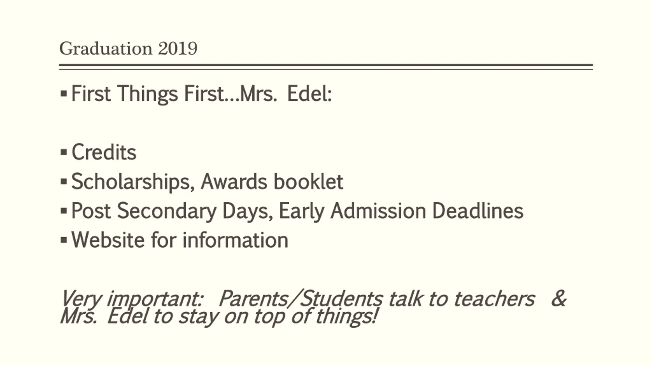 Graduation 2019 First Things First Mrs. Edel: First Things First Mrs. Edel: Credits Credits Scholarships, Awards booklet Scholarships, Awards booklet Post Secondary Days, Early Admission Deadlines Post Secondary Days, Early Admission Deadlines Website for information Website for information Very important: Parents/Students talk to teachers & Very important: Parents/Students talk to teachers & Mrs. Edel to stay on top of things! Mrs. Edel to stay on top of things!