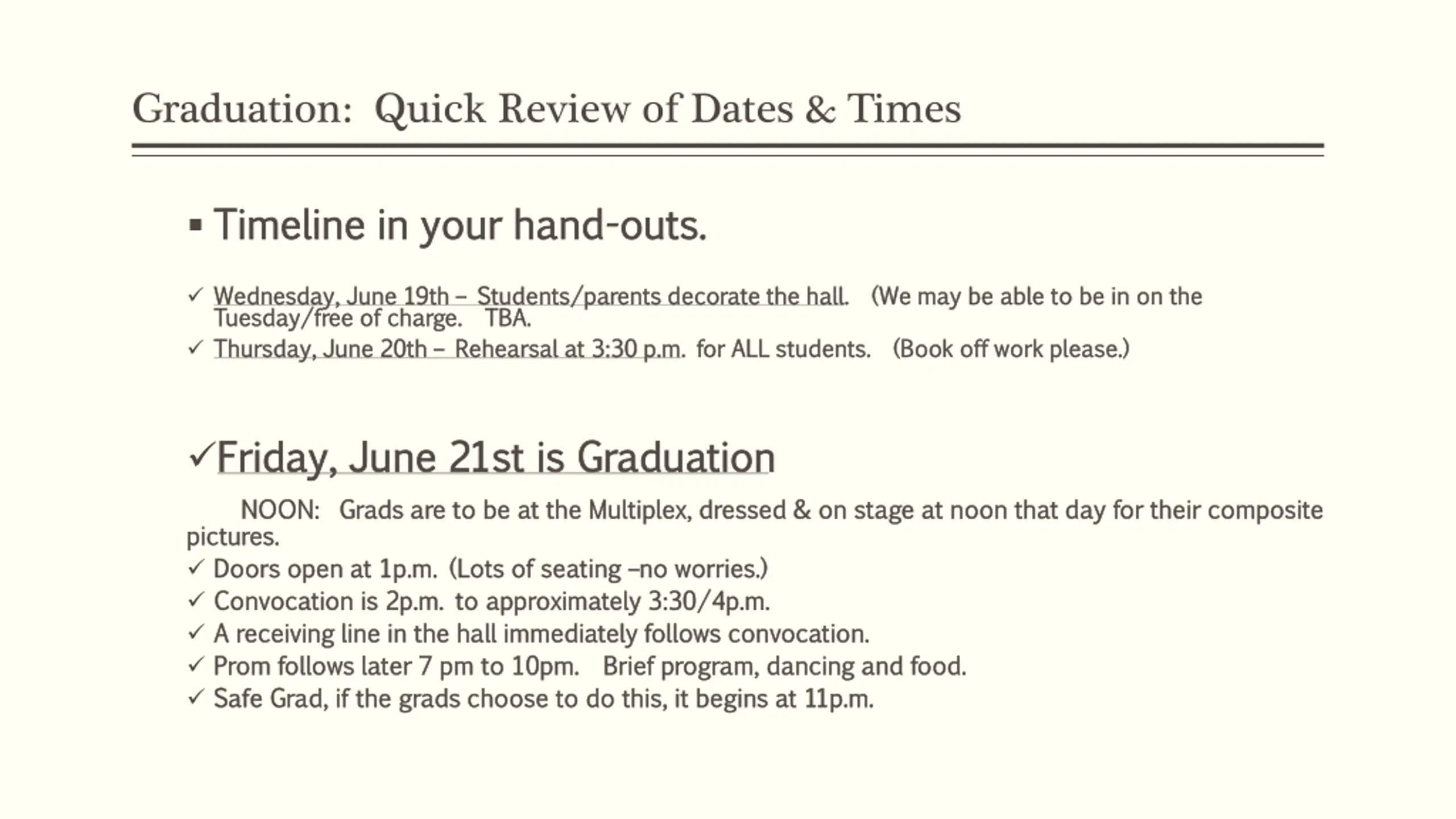Graduation: Quick Review of Dates & Times Timeline in your hand Timeline in your hand- -outs. outs. Wednesday, June Wednesday, June 19th Tuesday/free of charge. Tuesday/free of charge. TBA. Thursday Thursday, June , June 20th 19th Students/parents decorate the hall Students/parents decorate the hall. (We may be able to be in on the TBA. 20th Rehearsal at 3:30 p.m Rehearsal at 3:30 p.m. for ALL students. (Book off work please.) . for ALL students. (Book off work please.) . (We may be able to be in on the Friday, June 21st is Graduation Friday, June 21st is Graduation NOON: Grads are to be at the Multiplex, dressed & on stage at noon that day for their composite NOON: Grads are to be at the Multiplex, dressed & on stage at noon that day for their composite pictures. pictures. Doors open at 1p.m. (Lots of seating Doors open at 1p.m. (Lots of seating no worries.) no worries.) Convocation is 2p.m. to approximately 3:30/4p.m. Convocation is 2p.m. to approximately 3:30/4p.m. A receiving line in the hall immediately follows convocation. A receiving line in the hall immediately follows convocation. Prom follows later 7 pm to 10pm. Brief program, dancing and food. Prom follows later 7 pm to 10pm. Brief program, dancing and food. Safe Grad, if the grads choose to do this, it begins at 11p.m. Safe Grad, if the grads choose to do this, it begins at 11p.m.
