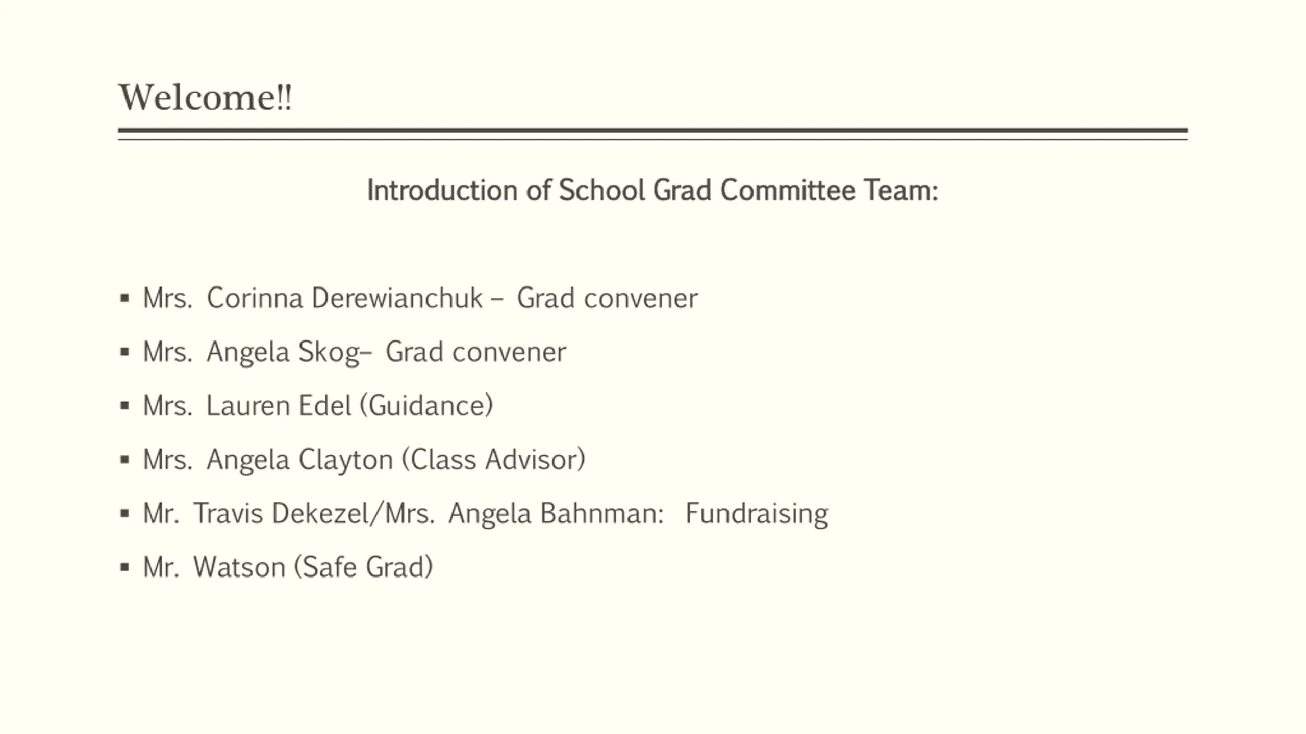 Welcome!! Introduction of School Grad Committee Team: Introduction of School Grad Committee Team: Mrs. Corinna Derewianchuk Grad convener Mrs. Angela Skog Grad convener Mrs. Lauren Edel (Guidance) Mrs. Angela Clayton (Class Advisor) Mr. Travis Dekezel/Mrs. Angela Bahnman: Fundraising Mr. Watson (Safe Grad)