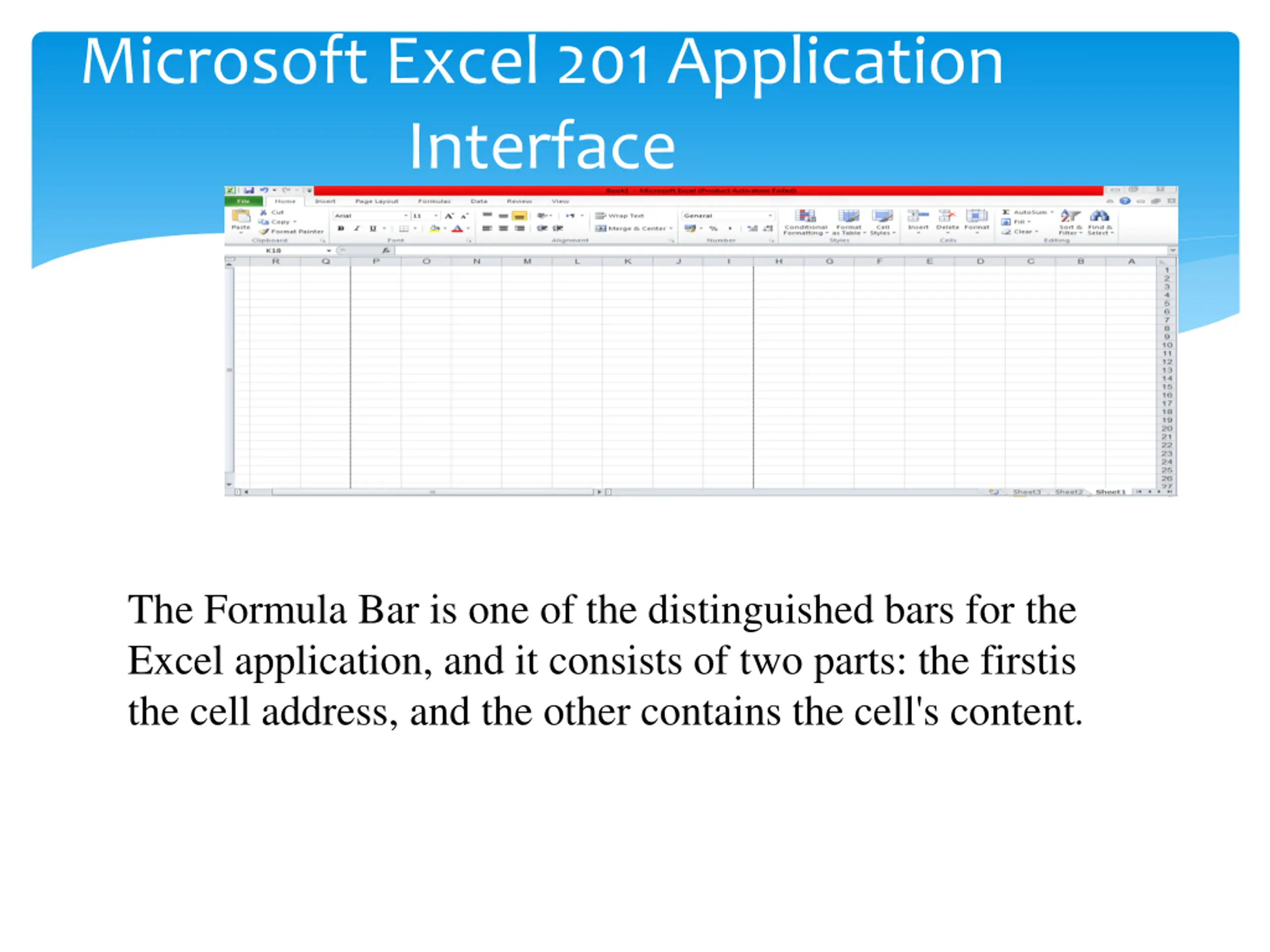 Microsoft Excel 201 Application Interface The Formula Bar is one of the distinguished bars for the Excel application, and it consists of two parts: the firstis the cell address, and the other contains the cell's content.