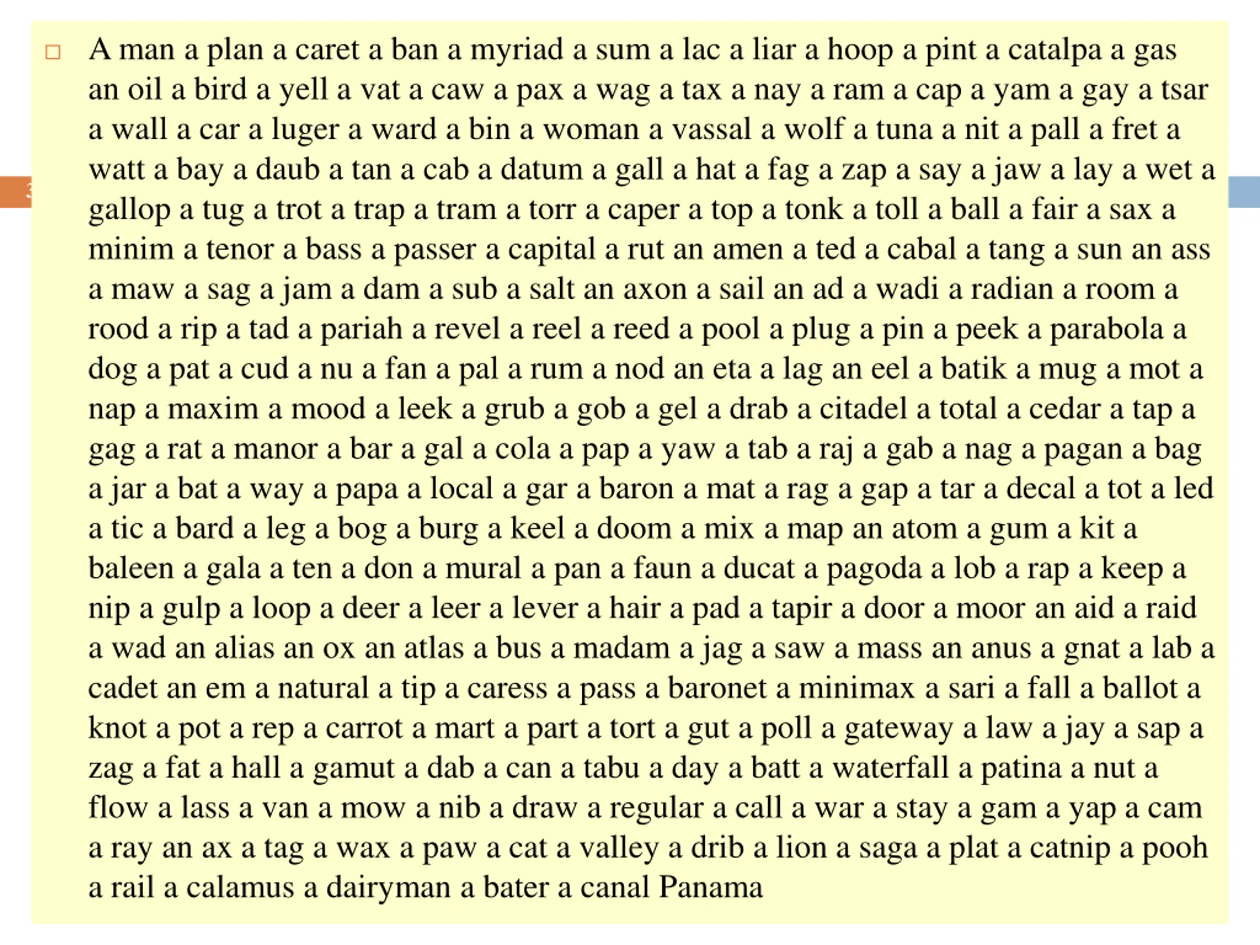 A man a plan a caret a ban a myriad a sum a lac a liar a hoop a pint a catalpa a gas an oil a bird a yell a vat a caw a pax a wag a tax a nay a ram a cap a yam a gay a tsar a wall a car a luger a ward a bin a woman a vassal a wolf a tuna a nit a pall a fret a watt a bay a daub a tan a cab a datum a gall a hat a fag a zap a say a jaw a lay a wet a gallop a tug a trot a trap a tram a torr a caper a top a tonk a toll a ball a fair a sax a minim a tenor a bass a passer a capital a rut an amen a ted a cabal a tang a sun an ass a maw a sag a jam a dam a sub a salt an axon a sail an ad a wadi a radian a room a rood a rip a tad a pariah a revel a reel a reed a pool a plug a pin a peek a parabola a dog a pat a cud a nu a fan a pal a rum a nod an eta a lag an eel a batik a mug a mot a nap a maxim a mood a leek a grub a gob a gel a drab a citadel a total a cedar a tap a gag a rat a manor a bar a gal a cola a pap a yaw a tab a raj a gab a nag a pagan a bag a jar a bat a way a papa a local a gar a baron a mat a rag a gap a tar a decal a tot a led a tic a bard a leg a bog a burg a keel a doom a mix a map an atom a gum a kit a baleen a gala a ten a don a mural a pan a faun a ducat a pagoda a lob a rap a keep a nip a gulp a loop a deer a leer a lever a hair a pad a tapir a door a moor an aid a raid a wad an alias an ox an atlas a bus a madam a jag a saw a mass an anus a gnat a lab a cadet an em a natural a tip a caress a pass a baronet a minimax a sari a fall a ballot a knot a pot a rep a carrot a mart a part a tort a gut a poll a gateway a law a jay a sap a zag a fat a hall a gamut a dab a can a tabu a day a batt a waterfall a patina a nut a flow a lass a van a mow a nib a draw a regular a call a war a stay a gam a yap a cam a ray an ax a tag a wax a paw a cat a valley a drib a lion a saga a plat a catnip a pooh a rail a calamus a dairyman a bater a canal Panama 34
