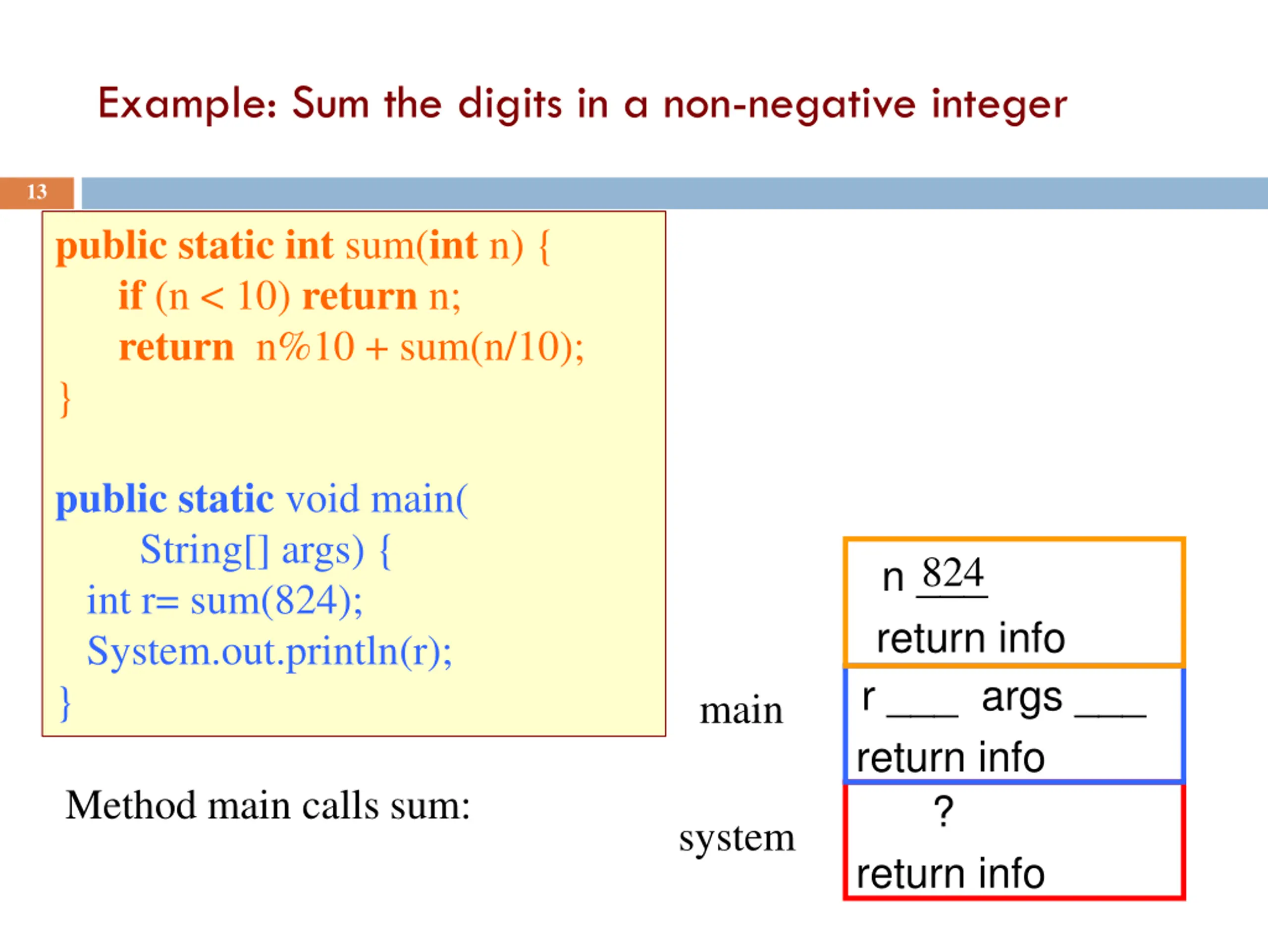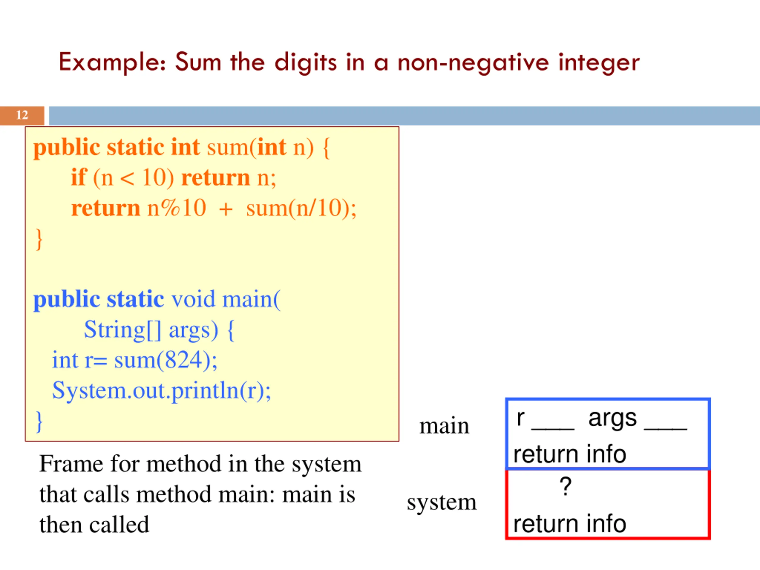 Example: Sum the digits in a non-negative integer 12 publicstaticint sum(int n) { if (n < 10) return n; return n%10 + sum(n/10); } publicstatic void main( String[] args) { int r= sum(824); System.out.println(r); } r ___ args ___ return info main Frame for method in the system that calls method main: main is then called ? system return info