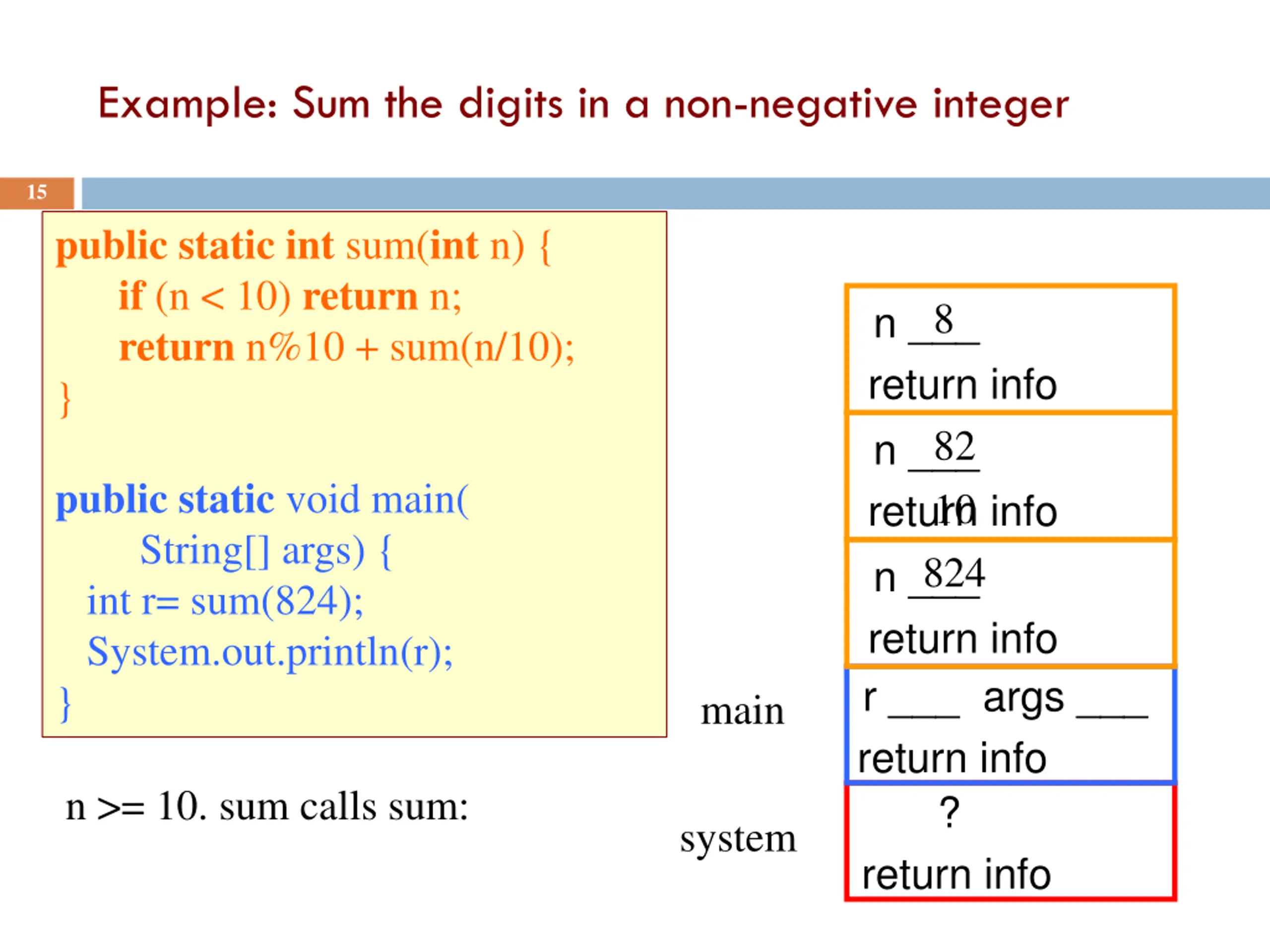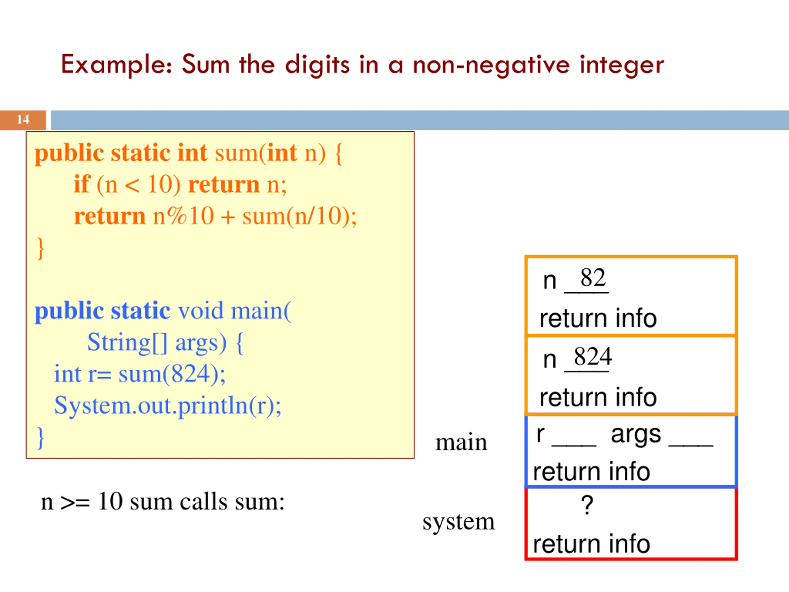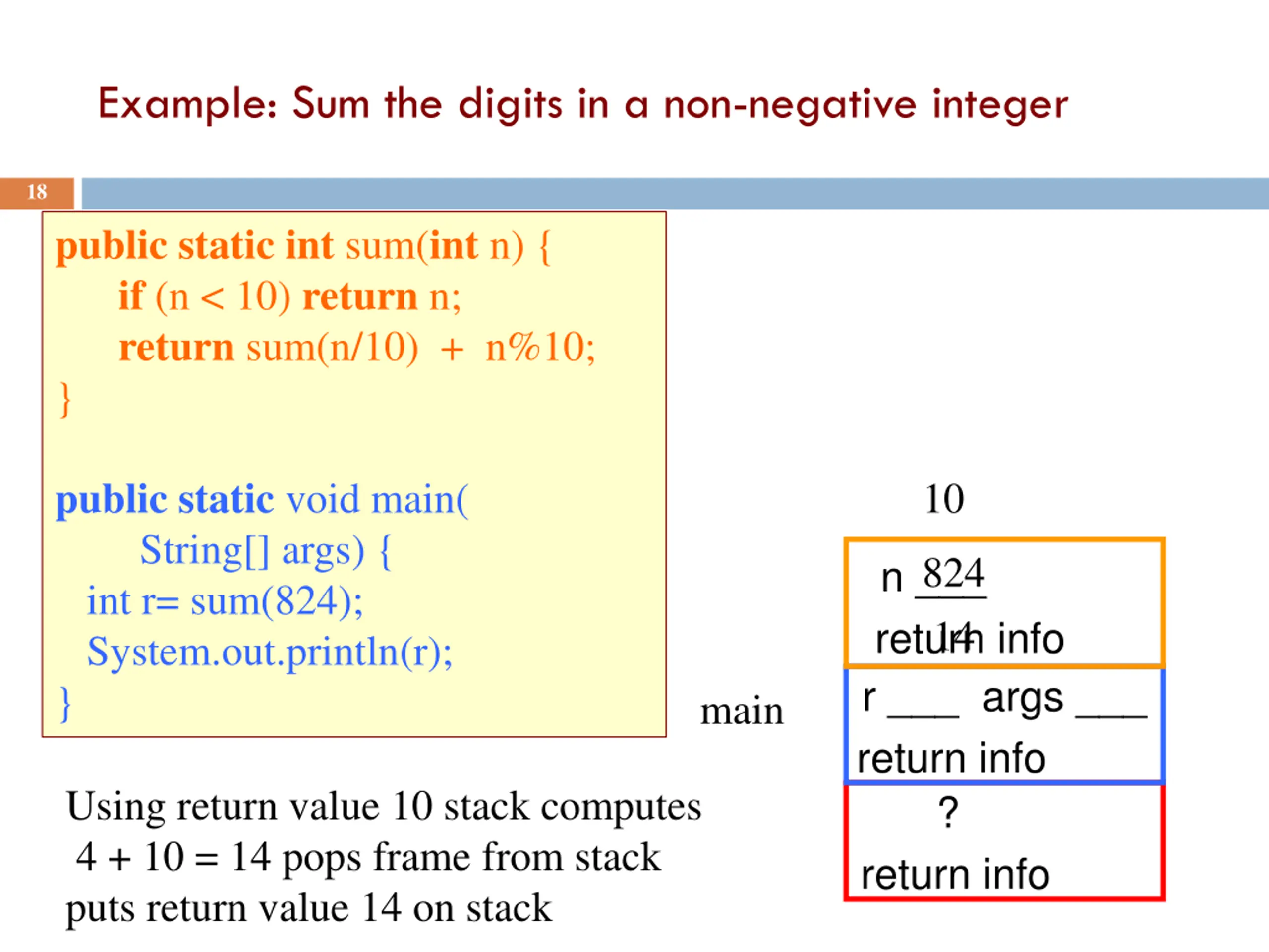 Example: Sum the digits in a non-negative integer 17 publicstaticint sum(int n) { if (n < 10) return n; return n%10 + sum(n/10); } 8 82 n ___ return info 10 publicstatic void main( String[] args) { int r= sum(824); System.out.println(r); } 824 n ___ return info r ___ args ___ return info main Using return value 8 stack computes 2 + 8 = 10 pops frame from stack puts return value 10 on stack ? return info