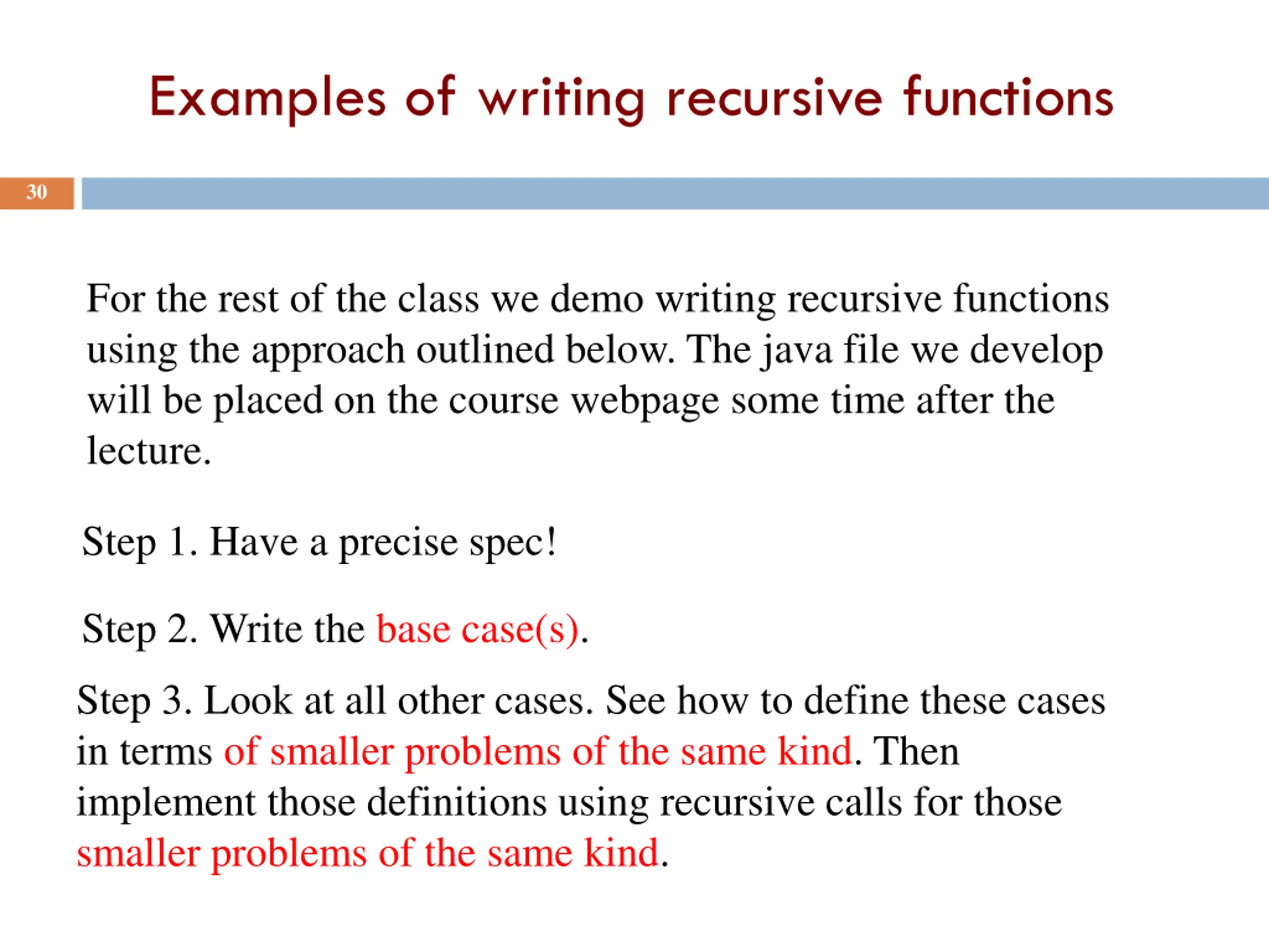 Examples of writing recursive functions 30 For the rest of the class we demo writing recursive functions using the approach outlined below. The java file we develop will be placed on the course webpage some time after the lecture. Step 1. Have a precise spec! Step 2. Write the base case(s). Step 3. Look at all other cases. See how to define these cases in terms of smaller problems of the same kind. Then implement those definitions using recursive calls for those smaller problems of the same kind.
