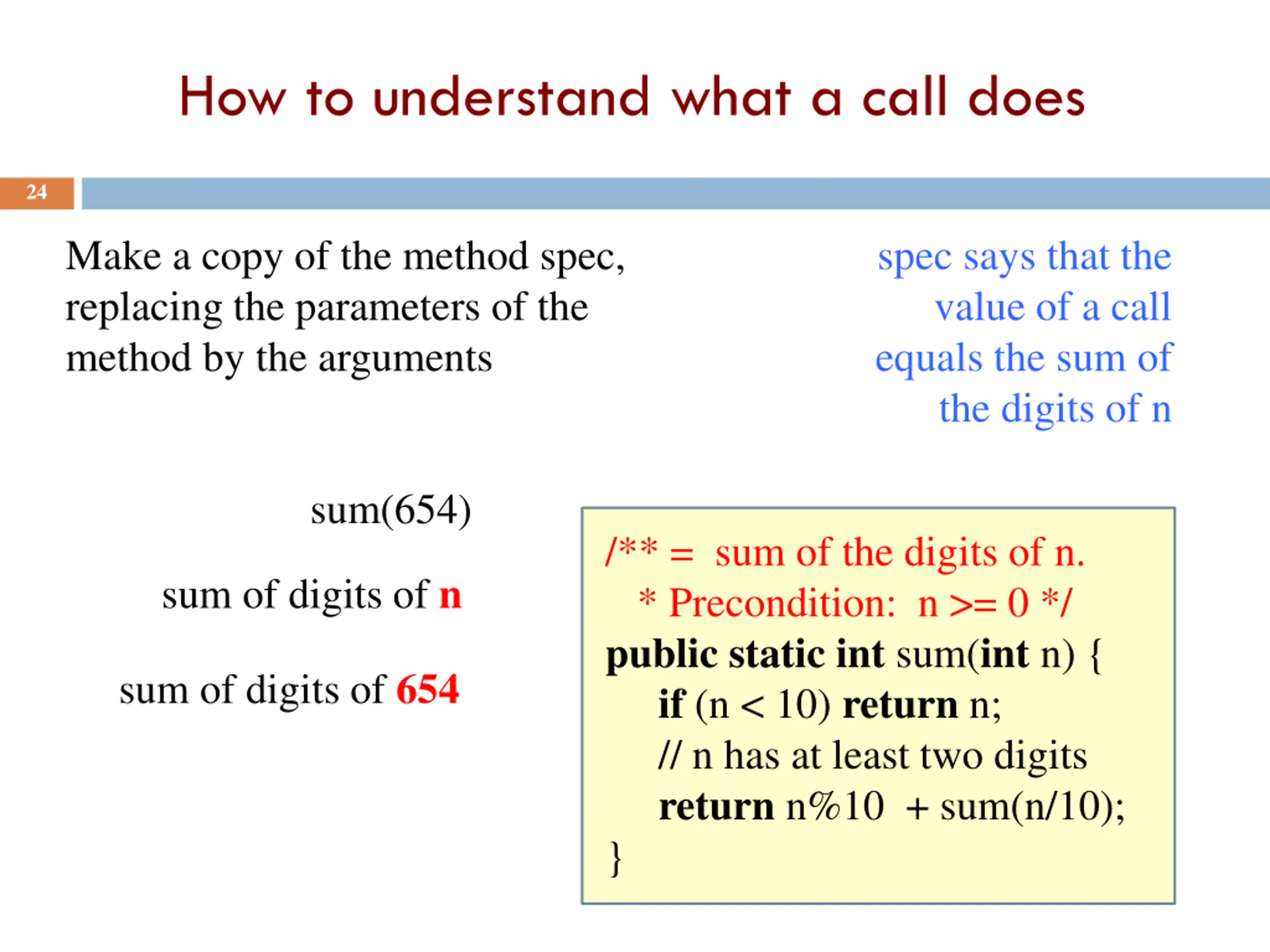 How to understand what a call does 24 Make a copy of the method spec, replacing the parameters of the method by the arguments spec says that the value of a call equals the sum of the digits of n sum(654) /** = sum of the digits of n. * Precondition: n >= 0 */ publicstaticint sum(int n) { if (n < 10) return n; // n has at least two digits return n%10 + sum(n/10); } sum of digits of n sum of digits of 654