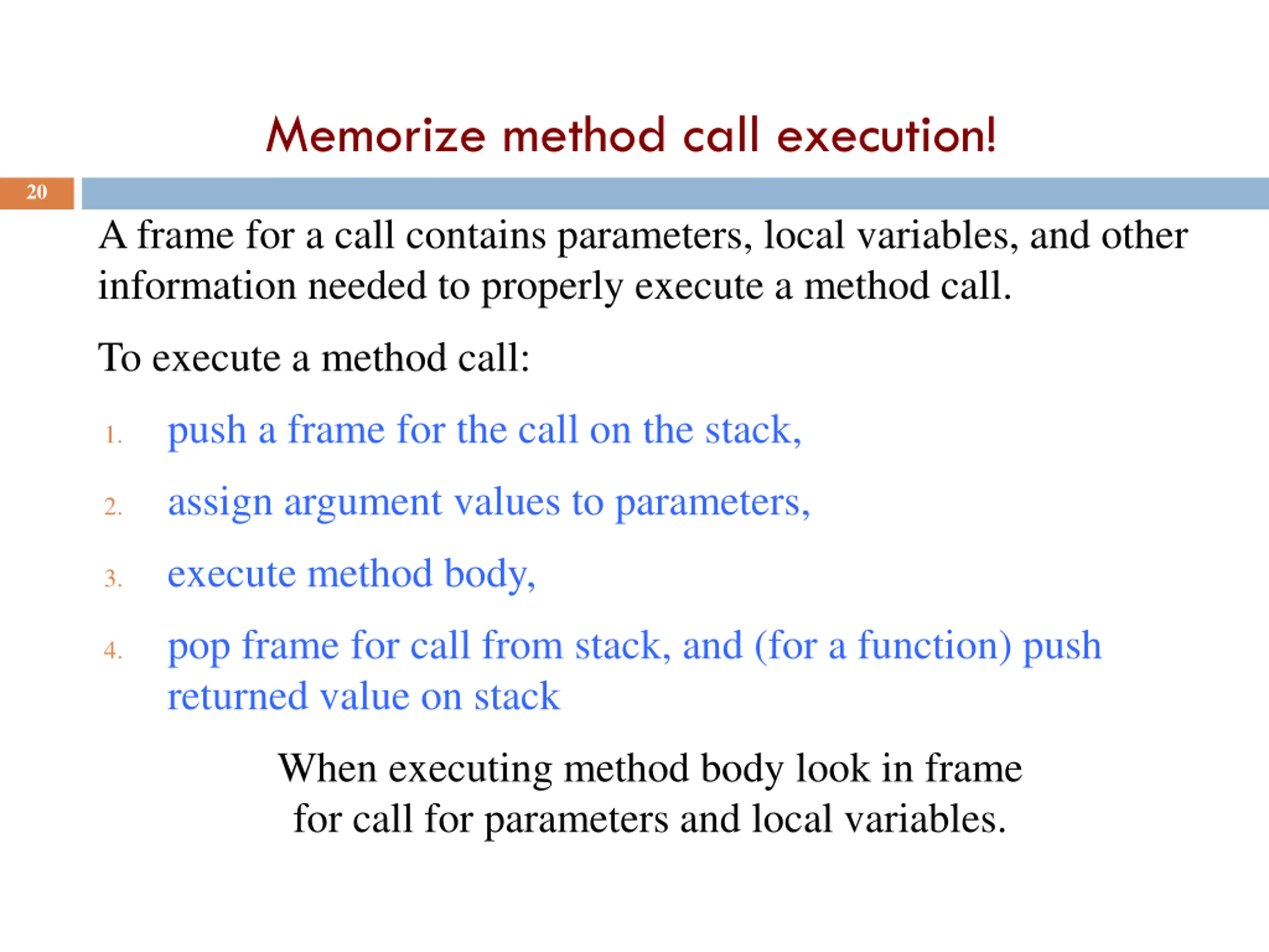 Memorize method call execution! 20 A frame for a call contains parameters, local variables, and other information needed to properly execute a method call. To execute a method call: push a frame for the call on the stack, 1. assign argument values to parameters, 2. execute method body, 3. pop frame for call from stack, and (for a function) push returned value on stack 4. When executing method body look in frame for call for parameters and local variables.