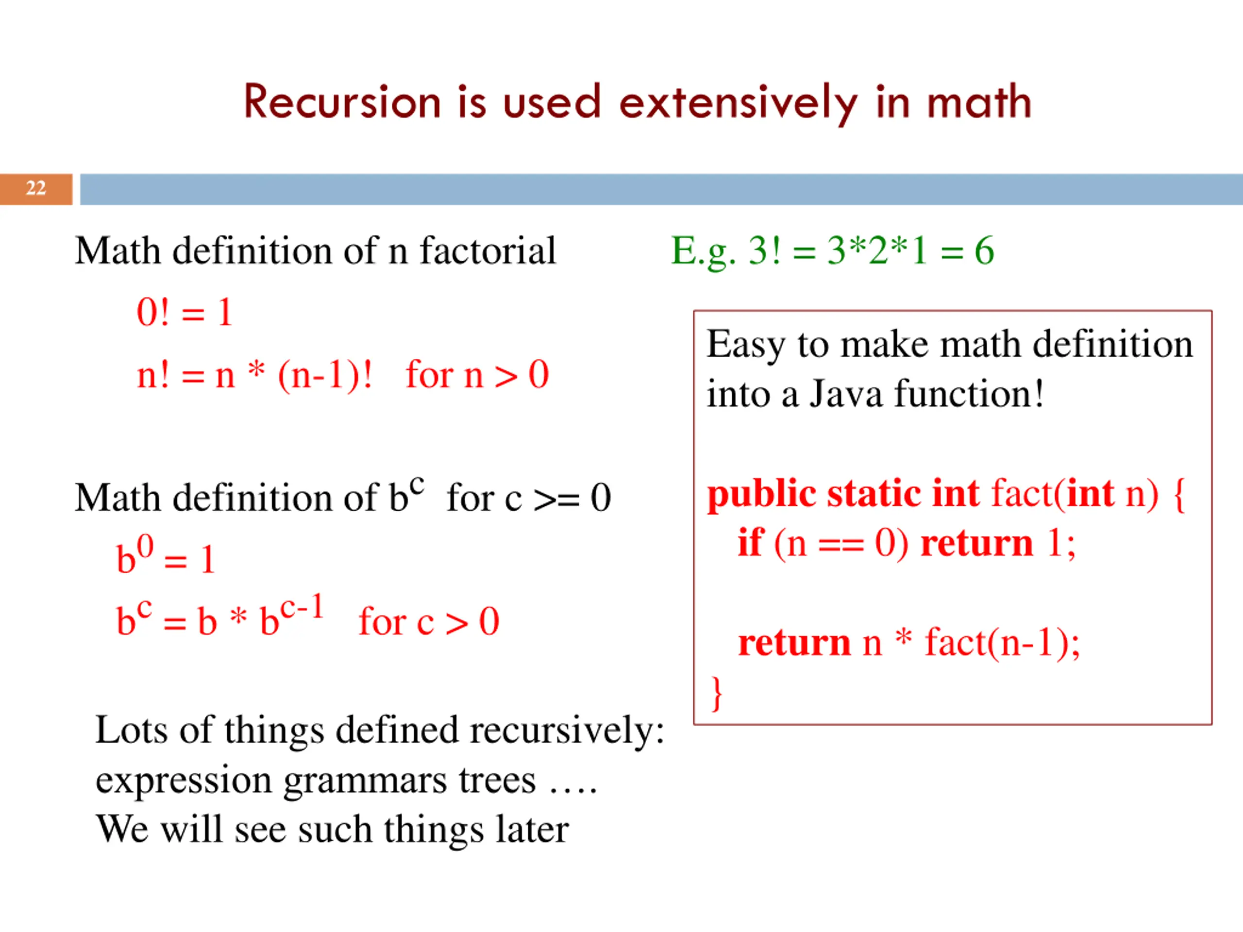 Recursion is used extensively in math 22 Math definition of n factorial E.g. 3! = 3*2*1 = 6 0! = 1 n! = n * (n-1)! for n > 0 Easy to make math definition into a Java function! Math definition of bc for c >= 0 b0 = 1 bc = b * bc-1 for c > 0 publicstaticint fact(int n) { if (n == 0) return 1; return n * fact(n-1); } Lots of things defined recursively: expression grammars trees . We will see such things later