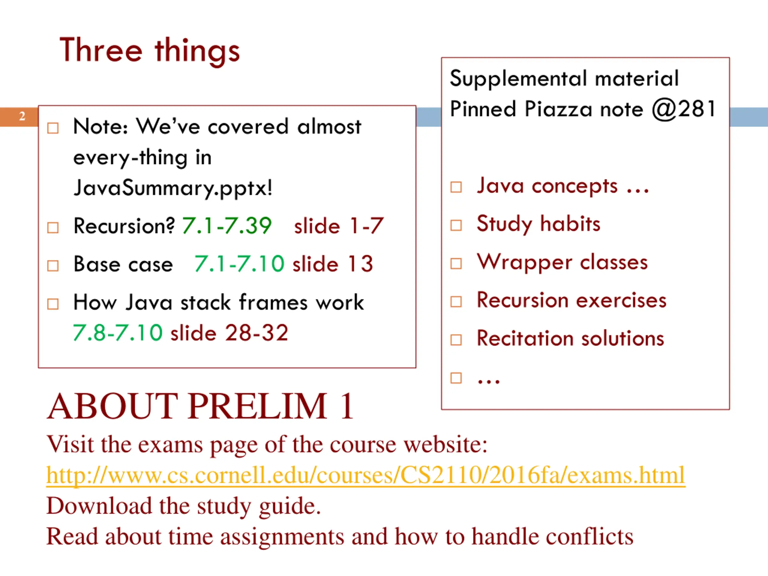 Three things Supplemental material Pinned Piazza note @281 2 Note: We ve covered almost every-thing in JavaSummary.pptx! Java concepts Study habits Recursion? 7.1-7.39 slide 1-7 Wrapper classes Base case 7.1-7.10 slide 13 Recursion exercises How Java stack frames work 7.8-7.10 slide 28-32 Recitation solutions ABOUT PRELIM 1 Visit the exams page of the course website: http://www.cs.cornell.edu/courses/CS2110/2016fa/exams.html Download the study guide. Read about time assignments and how to handle conflicts