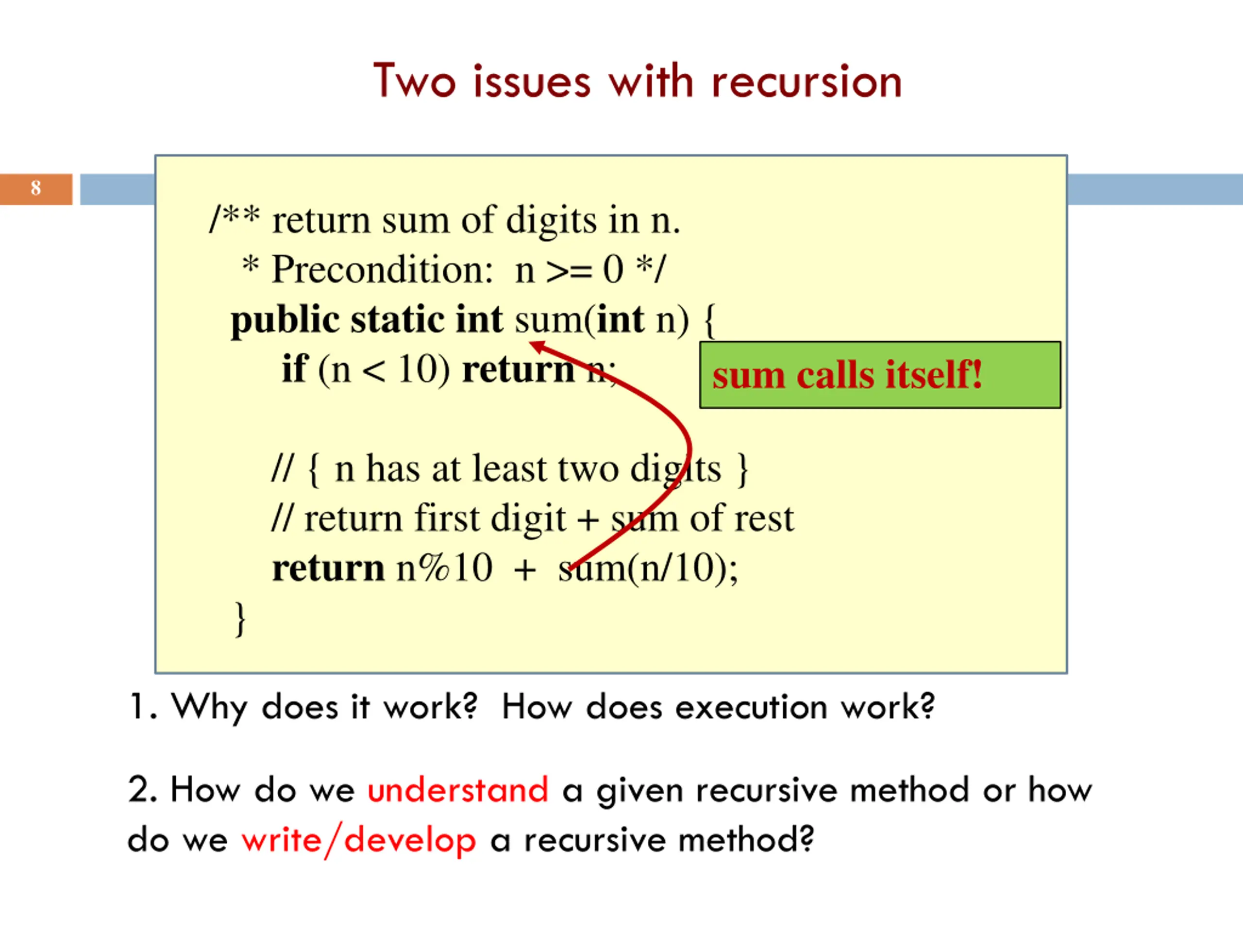 Two issues with recursion 8 /** return sum of digits in n. * Precondition: n >= 0 */ publicstaticint sum(int n) { if (n < 10) return n; sum calls itself! // { n has at least two digits } // return first digit + sum of rest return n%10 + sum(n/10); } 1. Why does it work? How does execution work? 2. How do we understand a given recursive method or how do we write/develop a recursive method?