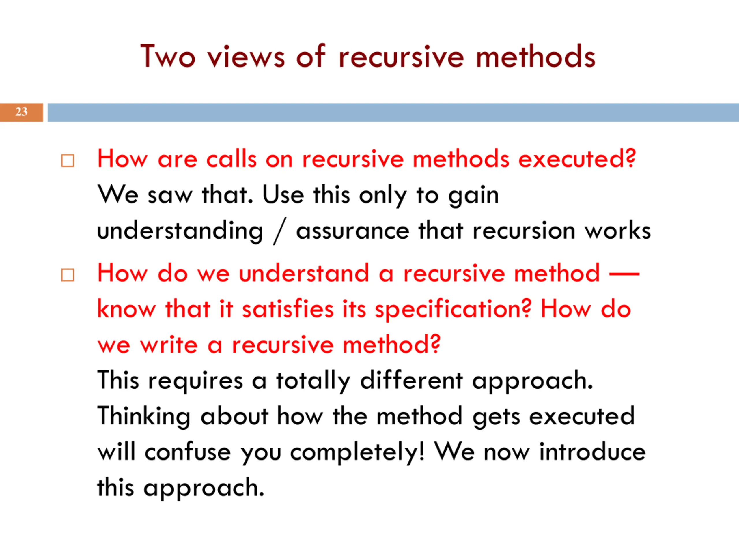 Two views of recursive methods 23 How are calls on recursive methods executed? We saw that. Use this only to gain understanding / assurance that recursion works How do we understand a recursive method know that it satisfies its specification? How do we write a recursive method? This requires a totally different approach. Thinking about how the method gets executed will confuse you completely! We now introduce this approach.