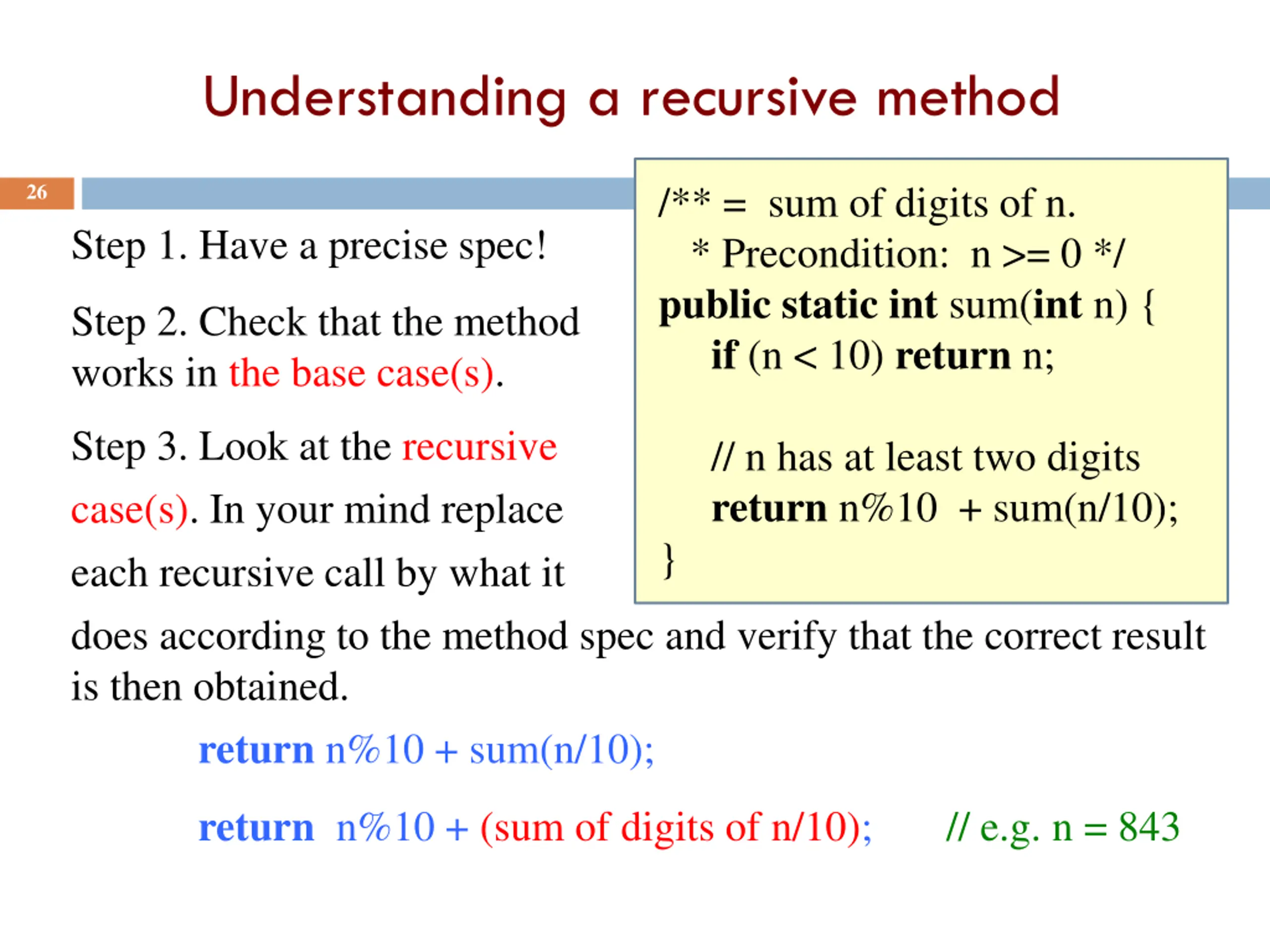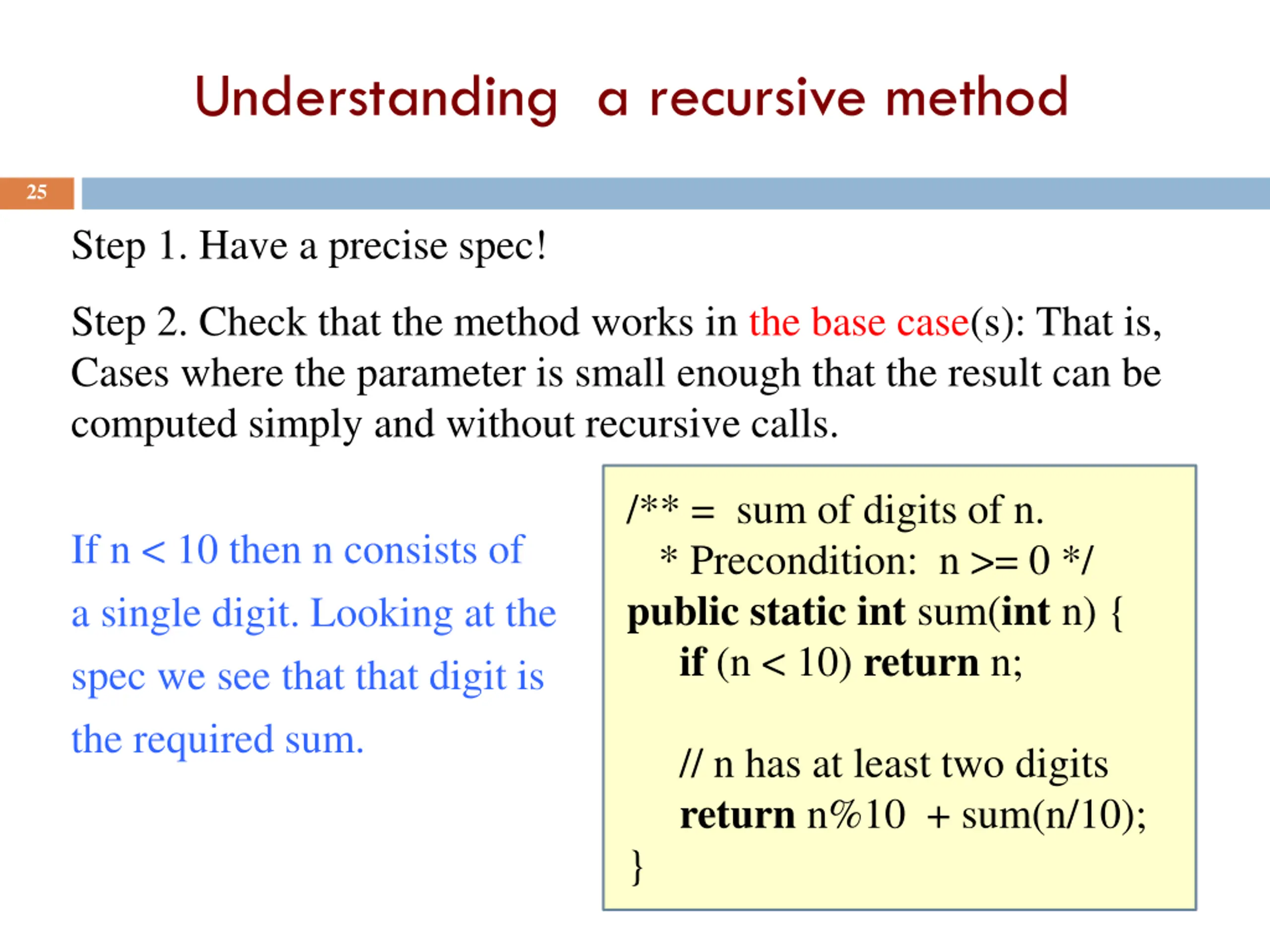 Understanding a recursive method 25 Step 1. Have a precise spec! Step 2. Check that the method works in the base case(s): That is, Cases where the parameter is small enough that the result can be computed simply and without recursive calls. /** = sum of digits of n. * Precondition: n >= 0 */ publicstaticint sum(int n) { if (n < 10) return n; If n < 10 then n consists of a single digit. Looking at the spec we see that that digit is the required sum. // n has at least two digits return n%10 + sum(n/10); }