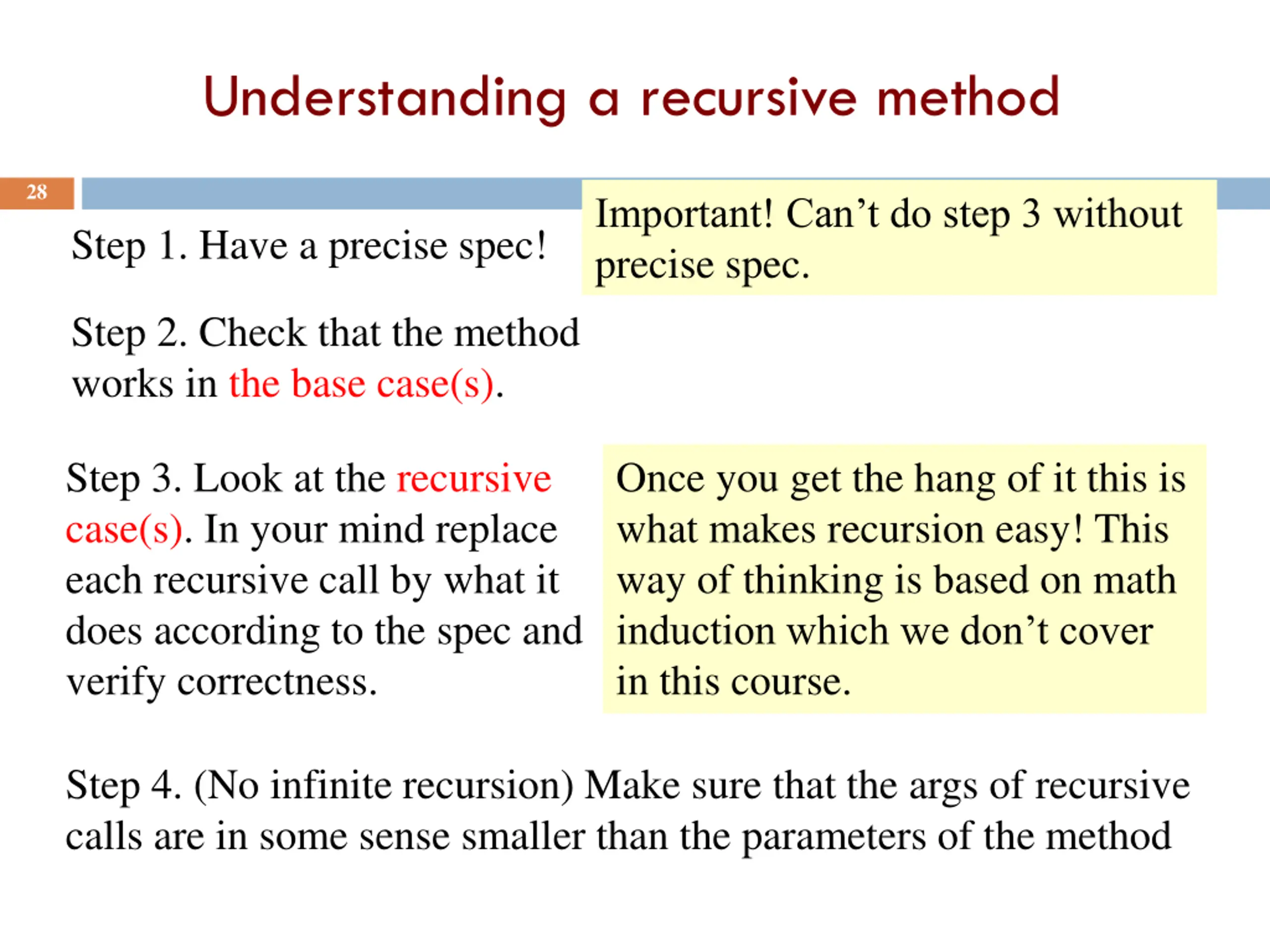 Understanding a recursive method 28 Important! Can t do step 3 without precise spec. Step 1. Have a precise spec! Step 2. Check that the method works in the base case(s). Step 3. Look at the recursive case(s). In your mind replace each recursive call by what it does according to the spec and verify correctness. Once you get the hang of it this is what makes recursion easy! This way of thinking is based on math induction which we don t cover in this course. Step 4. (No infinite recursion) Make sure that the args of recursive calls are in some sense smaller than the parameters of the method