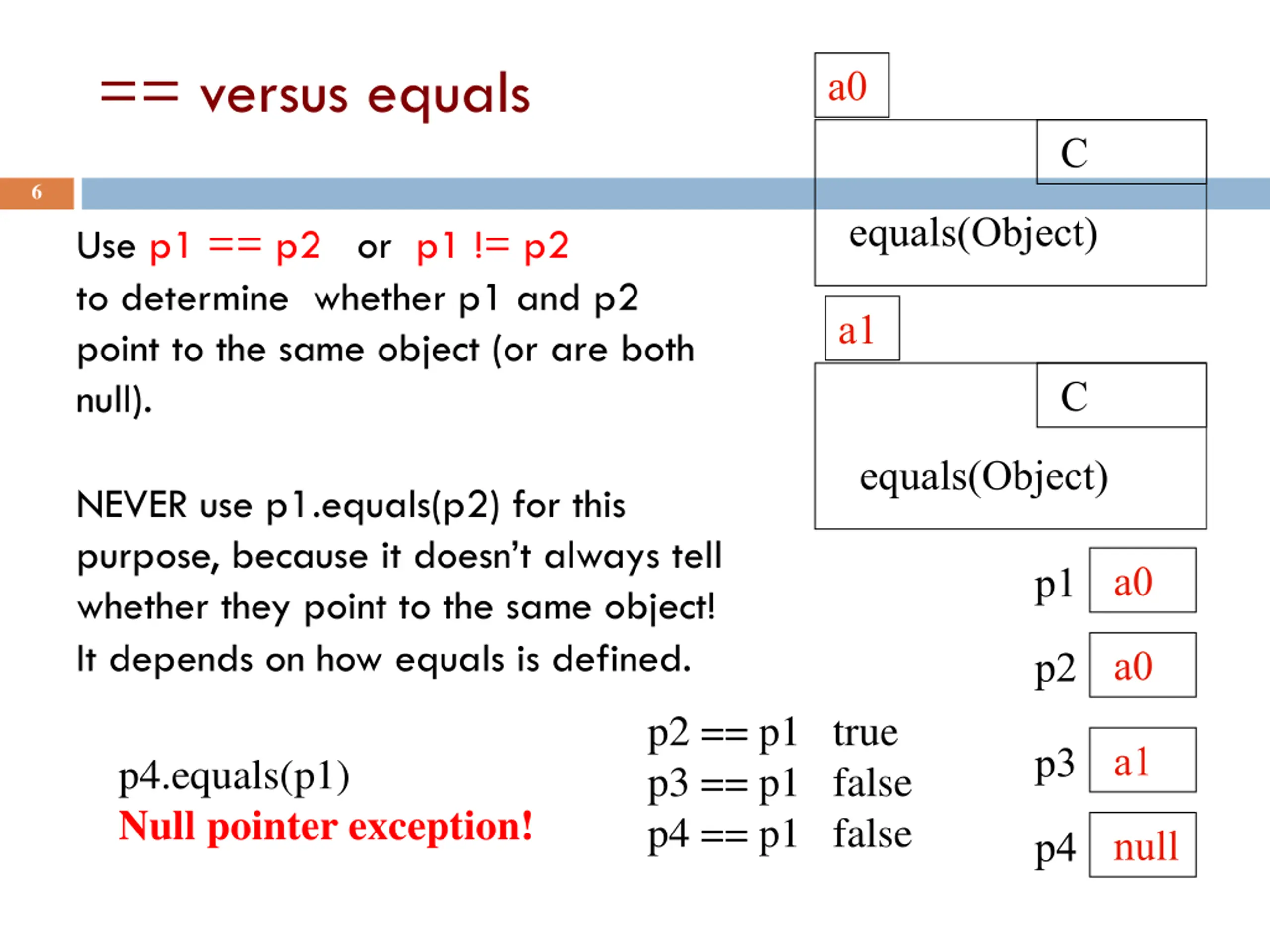 == versus equals a0 C 6 equals(Object) Use p1 == p2 or p1 != p2 to determine whether p1 and p2 point to the same object (or are both null). a1 C equals(Object) NEVER use p1.equals(p2) for this purpose, because it doesn t always tell whether they point to the same object! It depends on how equals is defined. p1 a0 p2 a0 p2 == p1 true p3 == p1 false p4 == p1 false p3 a1 p4.equals(p1) Null pointer exception! p4 null