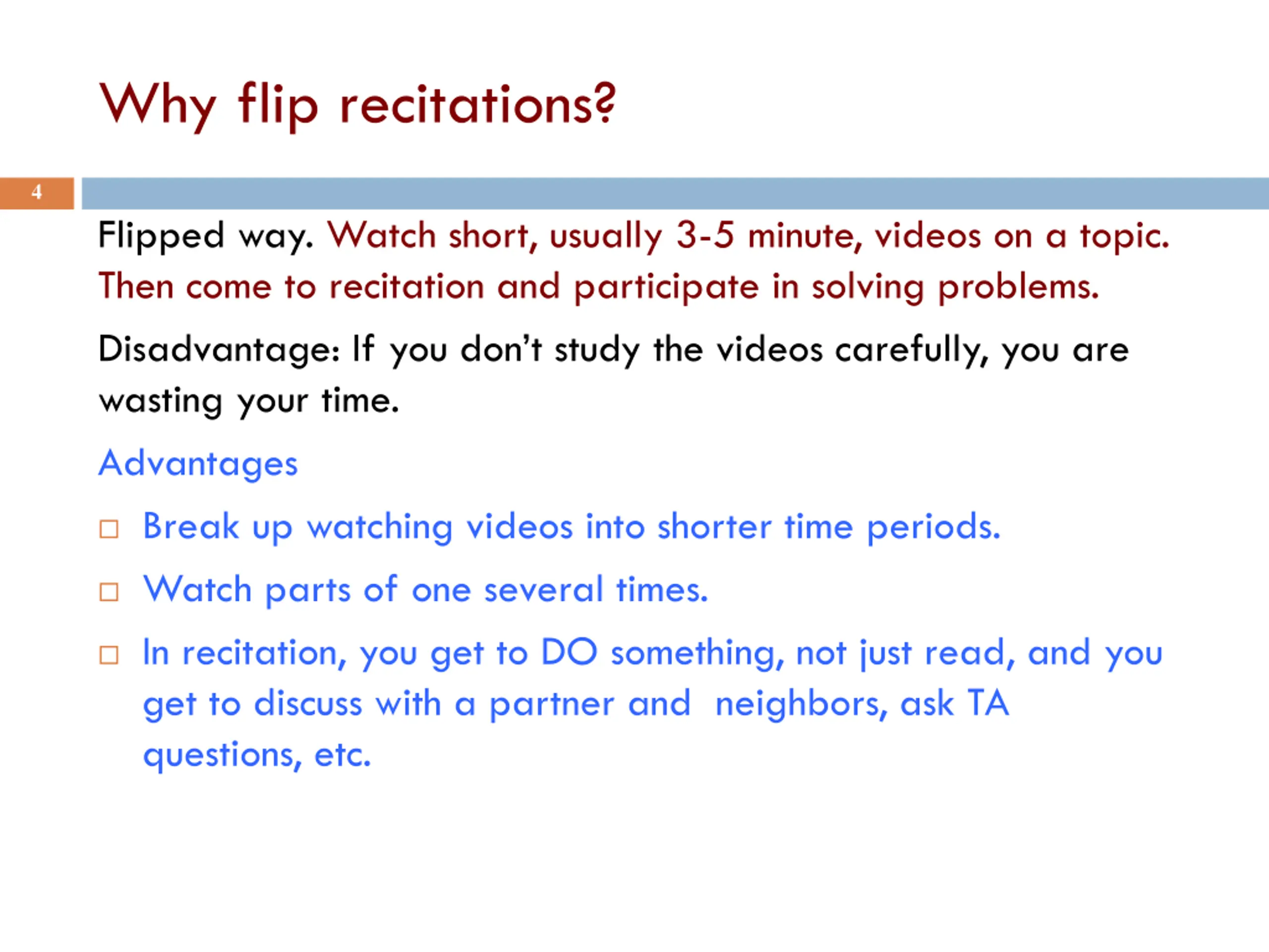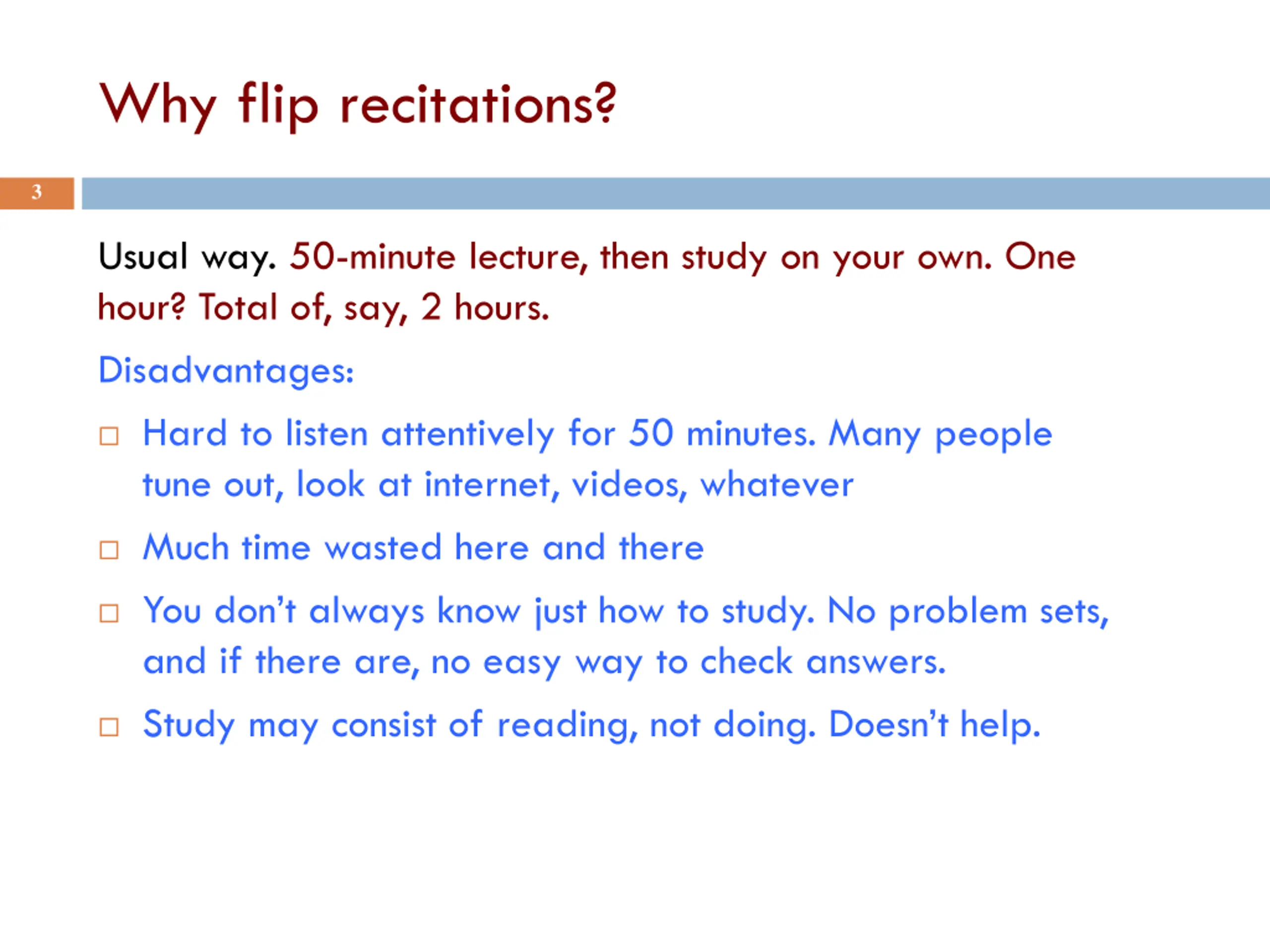 Why flip recitations? 3 Usual way. 50-minute lecture, then study on your own. One hour? Total of, say, 2 hours. Disadvantages: Hard to listen attentively for 50 minutes. Many people tune out, look at internet, videos, whatever Much time wasted here and there You don t always know just how to study. No problem sets, and if there are, no easy way to check answers. Study may consist of reading, not doing. Doesn t help.
