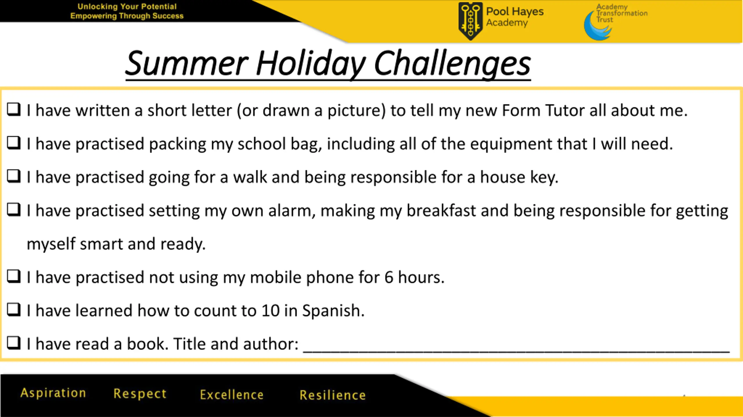 Summer Holiday Challenges Summer Holiday Challenges I have written a short letter (or drawn a picture) to tell my new Form Tutor all about me. I have practised packing my school bag, including all of the equipment that I will need. I have practised going for a walk and being responsible for a house key. I have practised setting my own alarm, making my breakfast and being responsible for getting myself smart and ready. I have practised not using my mobile phone for 6 hours. I have learned how to count to 10 in Spanish. I have read a book. Title and author: ______________________________________________ 08/04/2025 08/04/2025 4 4