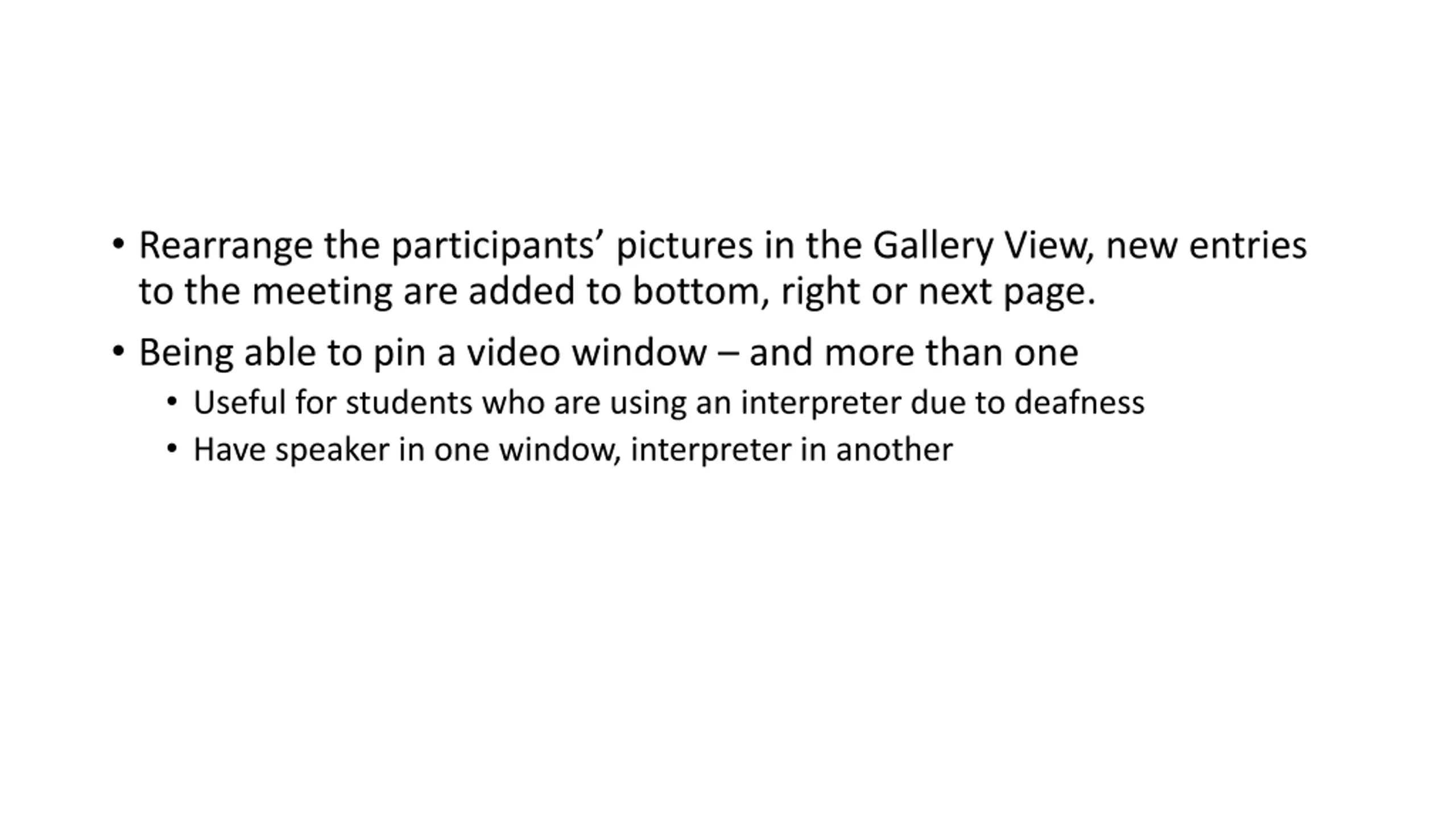 Rearrange the participants pictures in the Gallery View, new entries to the meeting are added to bottom, right or next page. Being able to pin a video window and more than one Useful for students who are using an interpreter due to deafness Have speaker in one window, interpreter in another