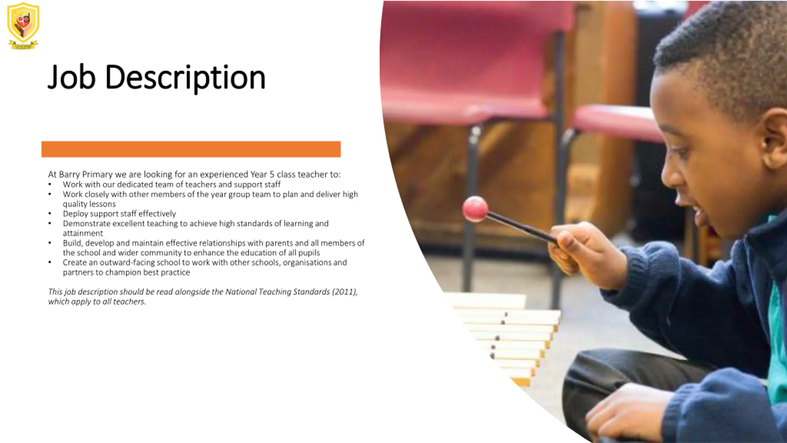 Job Description Job Description At Barry Primary we are looking for an experienced Year 5 class teacher to: Work with our dedicated team of teachers and support staff Work closely with other members of the year group team to plan and deliver high quality lessons Deploy support staff effectively Demonstrate excellent teaching to achieve high standards of learning and attainment Build, develop and maintain effective relationships with parents and all members of the school and wider community to enhance the education of all pupils Create an outward-facing school to work with other schools, organisations and partners to champion best practice This job description should be read alongside the National Teaching Standards (2011), which apply to all teachers.