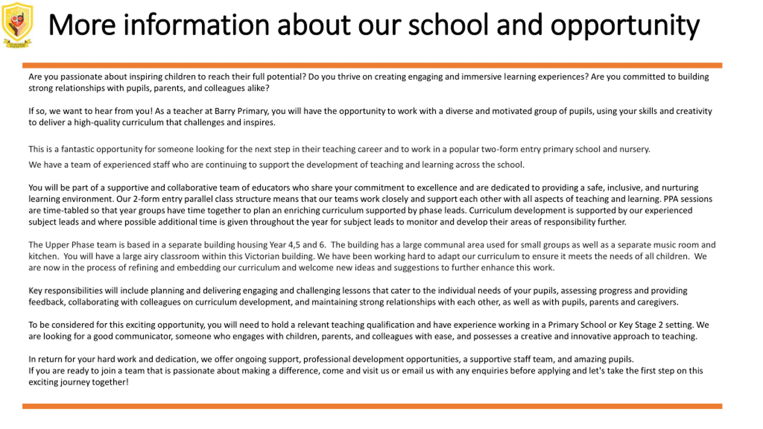 More information about our school and opportunity More information about our school and opportunity Are you passionate about inspiring children to reach their full potential? Do you thrive on creating engaging and immersive learning experiences? Are you committed to building strong relationships with pupils, parents, and colleagues alike? If so, we want to hear from you! As a teacher at Barry Primary, you will have the opportunity to work with a diverse and motivated group of pupils, using your skills and creativity to deliver a high-quality curriculum that challenges and inspires. This is a fantastic opportunity for someone looking for the next step in their teaching career and to work in a popular two-form entry primary school and nursery. We have a team of experienced staff who are continuing to support the development of teaching and learning across the school. You will be part of a supportive and collaborative team of educators who share your commitment to excellence and are dedicated to providing a safe, inclusive, and nurturing learning environment. Our 2-form entry parallel class structure means that our teams work closely and support each other with all aspects of teaching and learning. PPA sessions are time-tabled so that year groups have time together to plan an enriching curriculum supported by phase leads. Curriculum development is supported by our experienced subject leads and where possible additional time is given throughout the year for subject leads to monitor and develop their areas of responsibility further. The Upper Phase team is based in a separate building housing Year 4,5 and 6. The building has a large communal area used for small groups as well as a separate music room and kitchen. You will have a large airy classroom within this Victorian building. We have been working hard to adapt our curriculum to ensure it meets the needs of all children. We are now in the process of refining and embedding our curriculum and welcome new ideas and suggestions to further enhance this work. Key responsibilities will include planning and delivering engaging and challenging lessons that cater to the individual needs of your pupils, assessing progress and providing feedback, collaborating with colleagues on curriculum development, and maintaining strong relationships with each other, as well as with pupils, parents and caregivers. To be considered for this exciting opportunity, you will need to hold a relevant teaching qualification and have experience working in a Primary School or Key Stage 2 setting. We are looking for a good communicator, someone who engages with children, parents, and colleagues with ease, and possesses a creative and innovative approach to teaching. In return for your hard work and dedication, we offer ongoing support, professional development opportunities, a supportive staff team, and amazing pupils. If you are ready to join a team that is passionate about making a difference, come and visit us or email us with any enquiries before applying and let's take the first step on this exciting journey together!