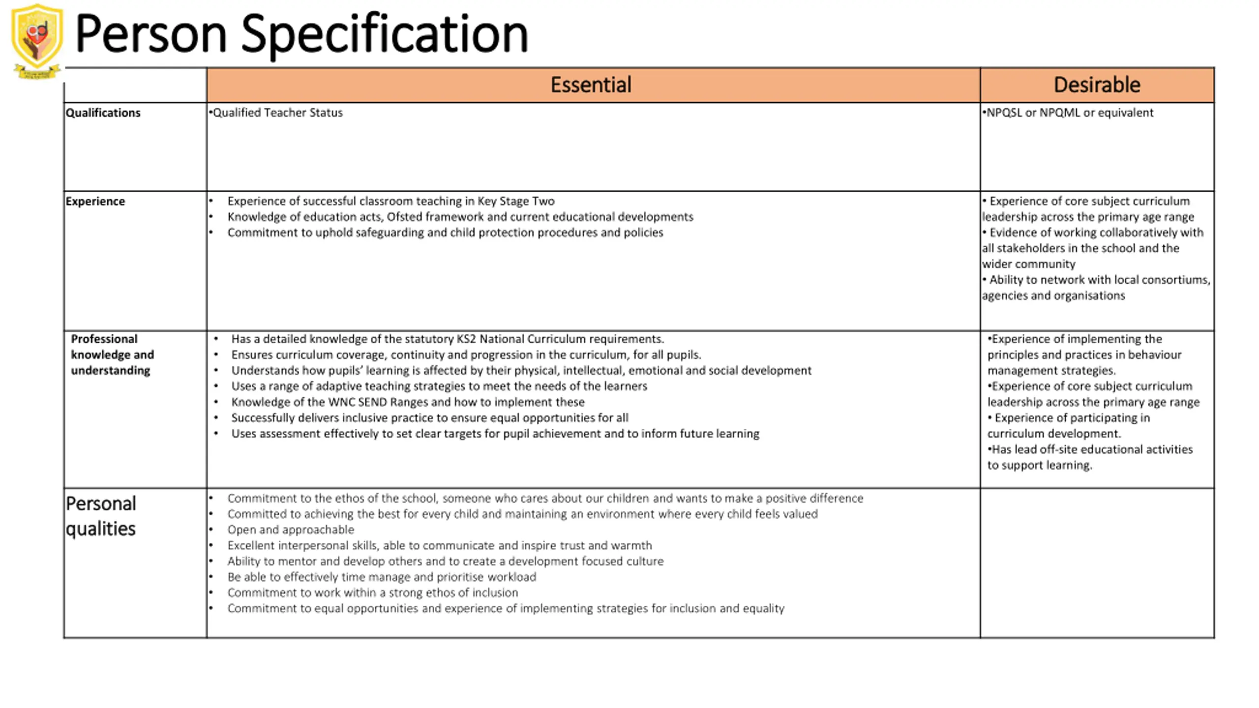 Person Specification Person Specification Essential Essential Desirable Desirable Qualified Teacher Status NPQSL or NPQML or equivalent Qualifications Experience of successful classroom teaching in Key Stage Two Knowledge of education acts, Ofsted framework and current educational developments Commitment to uphold safeguarding and child protection procedures and policies Experience of core subject curriculum leadership across the primary age range Evidence of working collaboratively with all stakeholders in the school and the wider community Ability to network with local consortiums, agencies and organisations Experience Experience of implementing the principles and practices in behaviour management strategies. Experience of core subject curriculum leadership across the primary age range Experience of participating in curriculum development. Has lead off-site educational activities to support learning. Professional knowledge and understanding Has a detailed knowledge of the statutory KS2 National Curriculum requirements. Ensures curriculum coverage, continuity and progression in the curriculum, for all pupils. Understands how pupils learning is affected by their physical, intellectual, emotional and social development Uses a range of adaptive teaching strategies to meet the needs of the learners Knowledge of the WNC SEND Ranges and how to implement these Successfully delivers inclusive practice to ensure equal opportunities for all Uses assessment effectively to set clear targets for pupil achievement and to inform future learning Commitment to the ethos of the school, someone who cares about our children and wants to make a positive difference Committed to achieving the best for every child and maintaining an environment where every child feels valued Open and approachable Excellent interpersonal skills, able to communicate and inspire trust and warmth Ability to mentor and develop others and to create a development focused culture Be able to effectively time manage and prioritise workload Commitment to work within a strong ethos of inclusion Commitment to equal opportunities and experience of implementing strategies for inclusion and equality Personal Personal qualities qualities