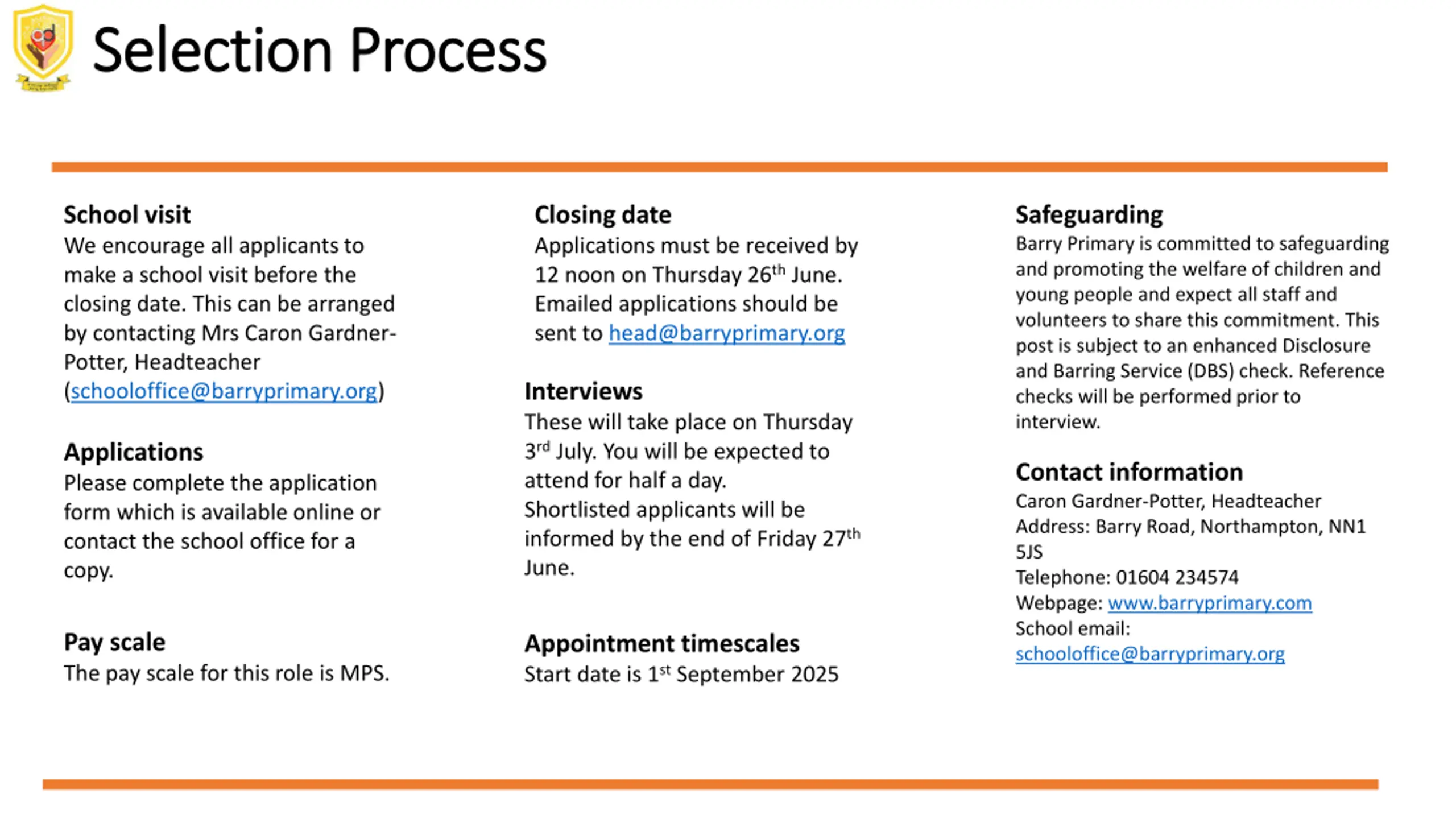 Selection Process Selection Process School visit We encourage all applicants to make a school visit before the closing date. This can be arranged by contacting Mrs Caron Gardner- Potter, Headteacher (schooloffice@barryprimary.org) Closing date Applications must be received by 12 noon on Thursday 26th June. Emailed applications should be sent to head@barryprimary.org Safeguarding Barry Primary is committed to safeguarding and promoting the welfare of children and young people and expect all staff and volunteers to share this commitment. This post is subject to an enhanced Disclosure and Barring Service (DBS) check. Reference checks will be performed prior to interview. Interviews These will take place on Thursday 3rd July. You will be expected to attend for half a day. Shortlisted applicants will be informed by the end of Friday 27th June. Applications Please complete the application form which is available online or contact the school office for a copy. Contact information Caron Gardner-Potter, Headteacher Address: Barry Road, Northampton, NN1 5JS Telephone: 01604 234574 Webpage: www.barryprimary.com School email: schooloffice@barryprimary.org Pay scale The pay scale for this role is MPS. Appointment timescales Start date is 1st September 2025