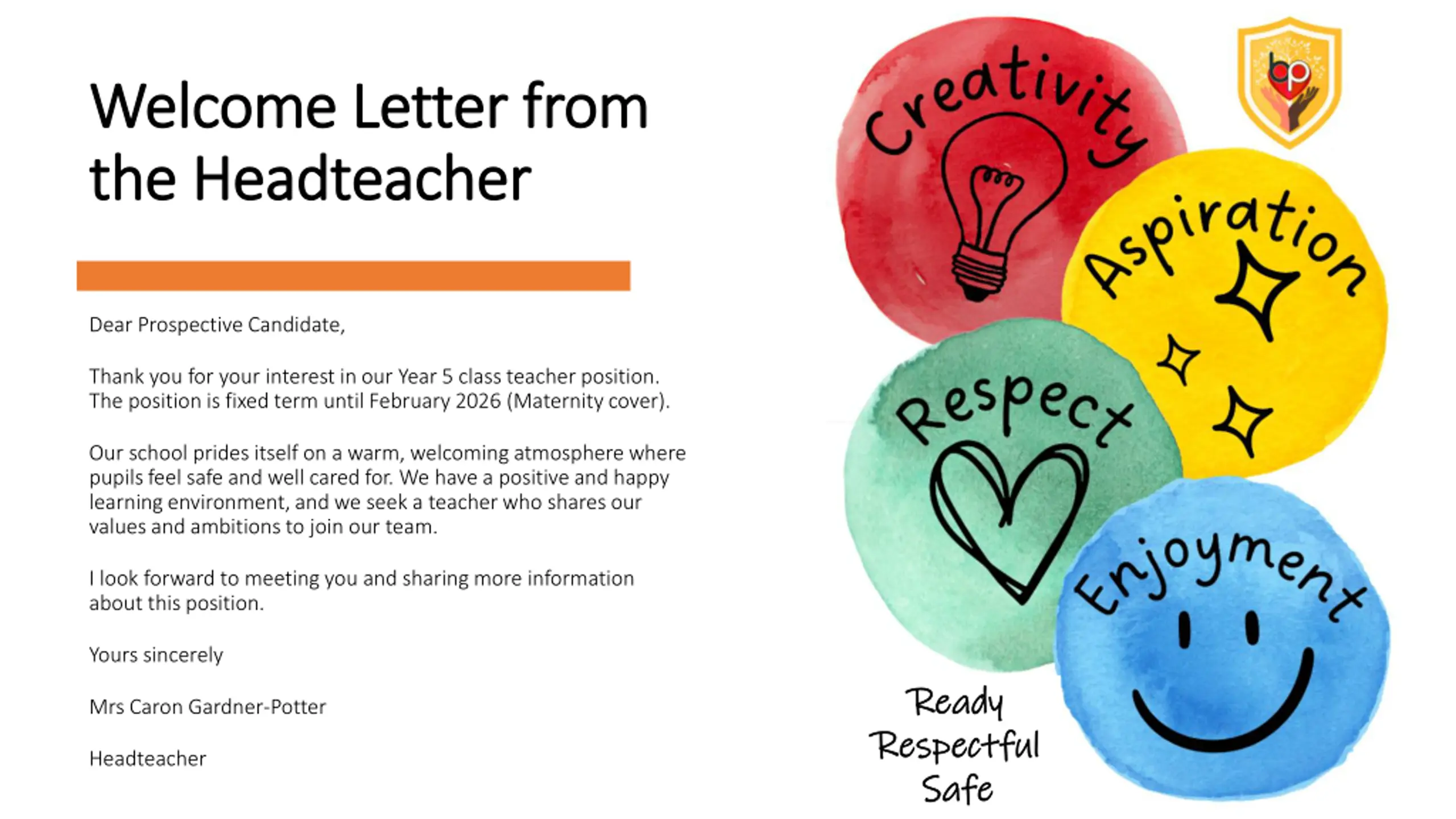 Welcome Letter from Welcome Letter from the Headteacher the Headteacher Dear Prospective Candidate, Thank you for your interest in our Year 5 class teacher position. The position is fixed term until February 2026 (Maternity cover). Our school prides itself on a warm, welcoming atmosphere where pupils feel safe and well cared for. We have a positive and happy learning environment, and we seek a teacher who shares our values and ambitions to join our team. I look forward to meeting you and sharing more information about this position. Yours sincerely Ready Ready Mrs Caron Gardner-Potter Ready Respectful Respectful Safe Safe Headteacher