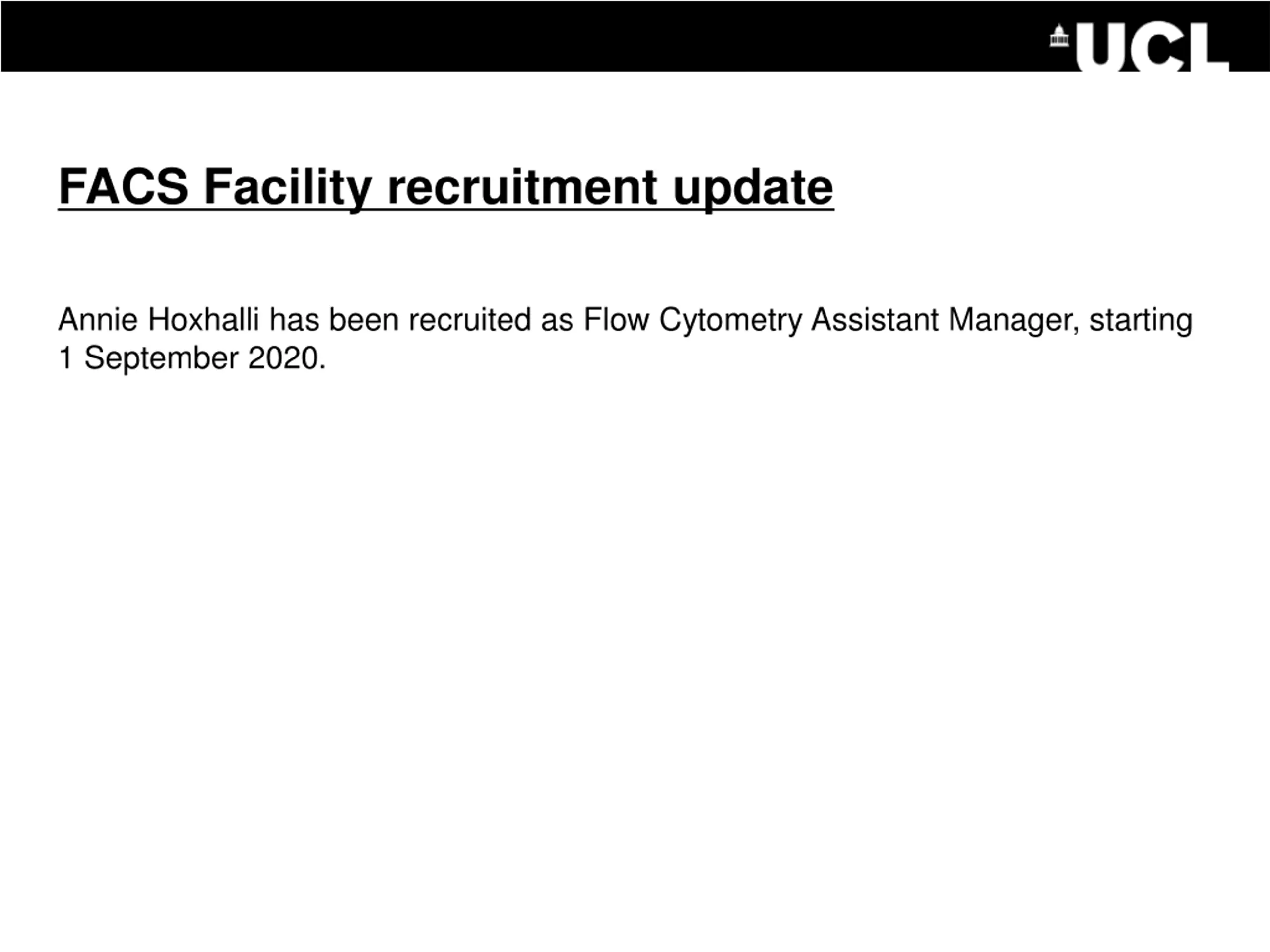 FACS Facility recruitment update Annie Hoxhalli has been recruited as Flow Cytometry Assistant Manager, starting 1 September 2020.