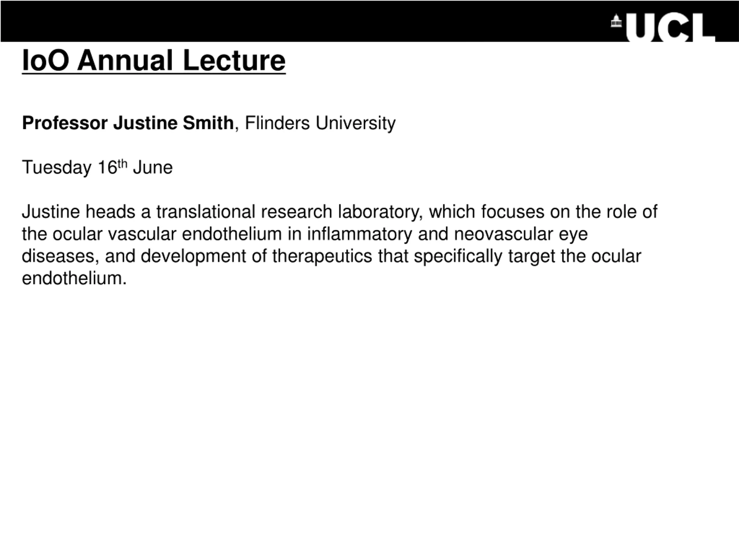 IoO Annual Lecture Professor Justine Smith, Flinders University Tuesday 16th June Justine heads a translational research laboratory, which focuses on the role of the ocular vascular endothelium in inflammatory and neovascular eye diseases, and development of therapeutics that specifically target the ocular endothelium.