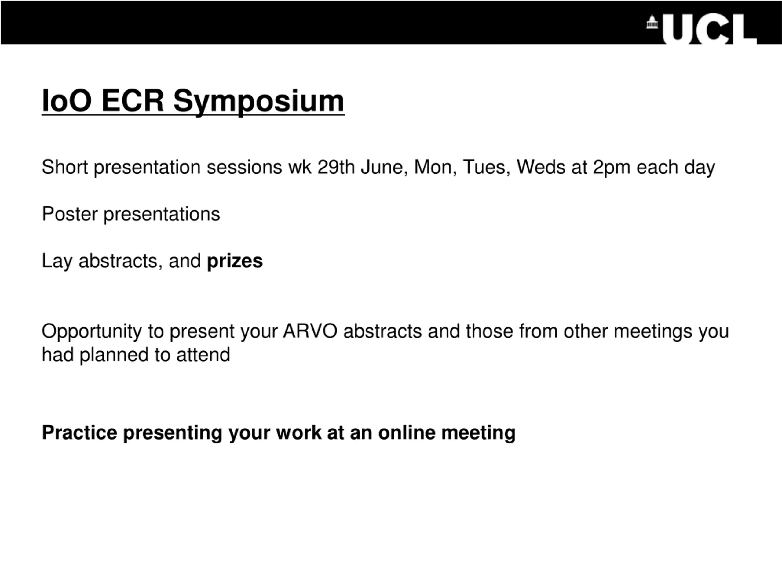IoO ECR Symposium Short presentation sessions wk 29th June, Mon, Tues, Weds at 2pm each day Poster presentations Lay abstracts, and prizes Opportunity to present your ARVO abstracts and those from other meetings you had planned to attend Practice presenting your work at an online meeting