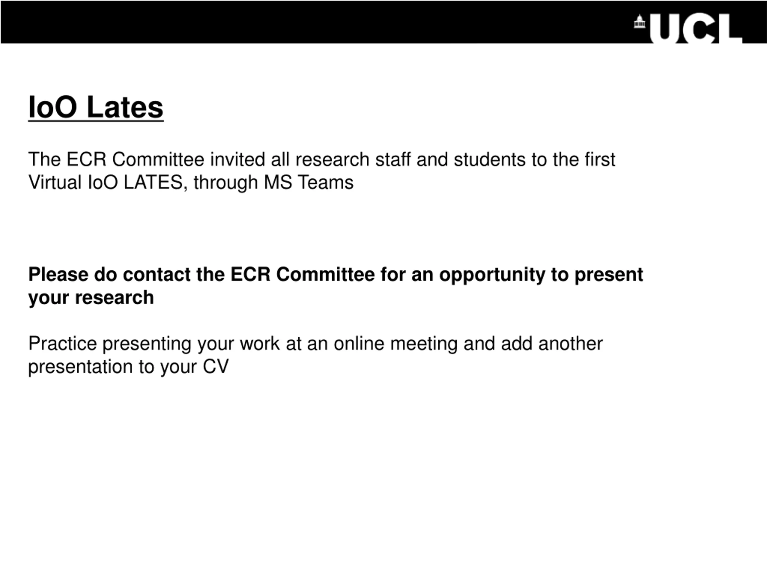 IoO Lates The ECR Committee invited all research staff and students to the first Virtual IoO LATES, through MS Teams Please do contact the ECR Committee for an opportunity to present your research Practice presenting your work at an online meeting and add another presentation to your CV