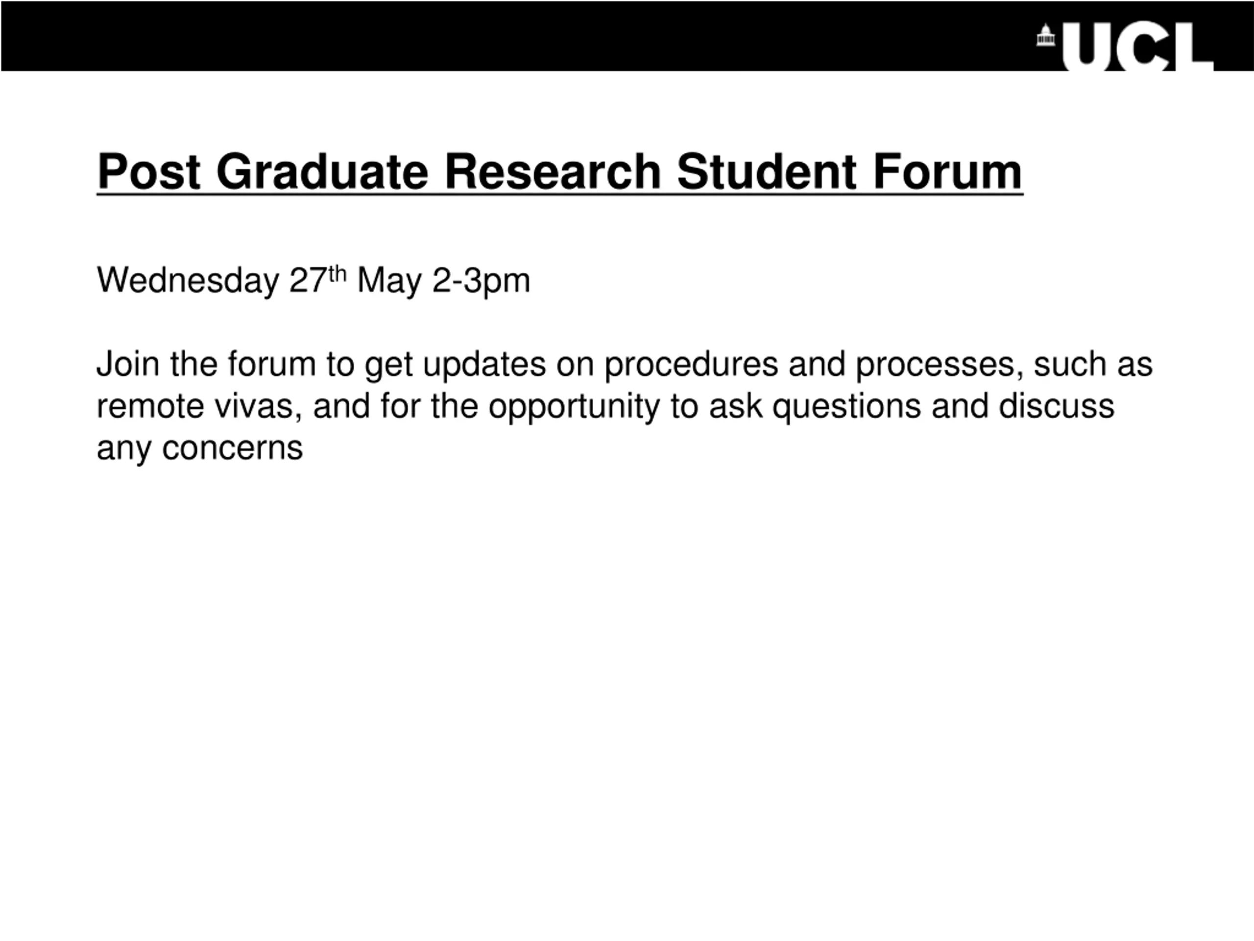 Post Graduate Research Student Forum Wednesday 27th May 2-3pm Join the forum to get updates on procedures and processes, such as remote vivas, and for the opportunity to ask questions and discuss any concerns