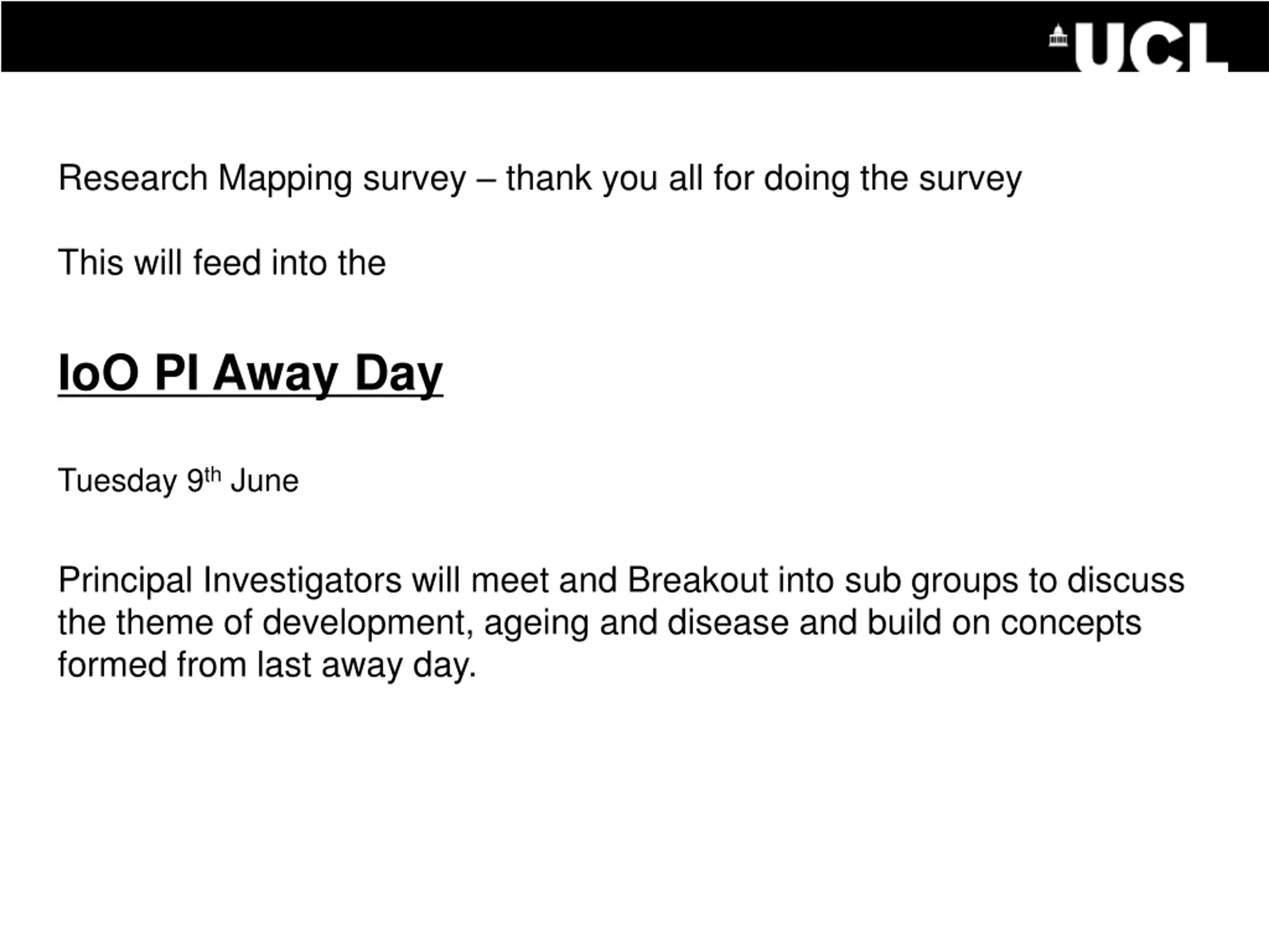 Research Mapping survey thank you all for doing the survey This will feed into the IoO PI Away Day Tuesday 9th June Principal Investigators will meet and Breakout into sub groups to discuss the theme of development, ageing and disease and build on concepts formed from last away day.