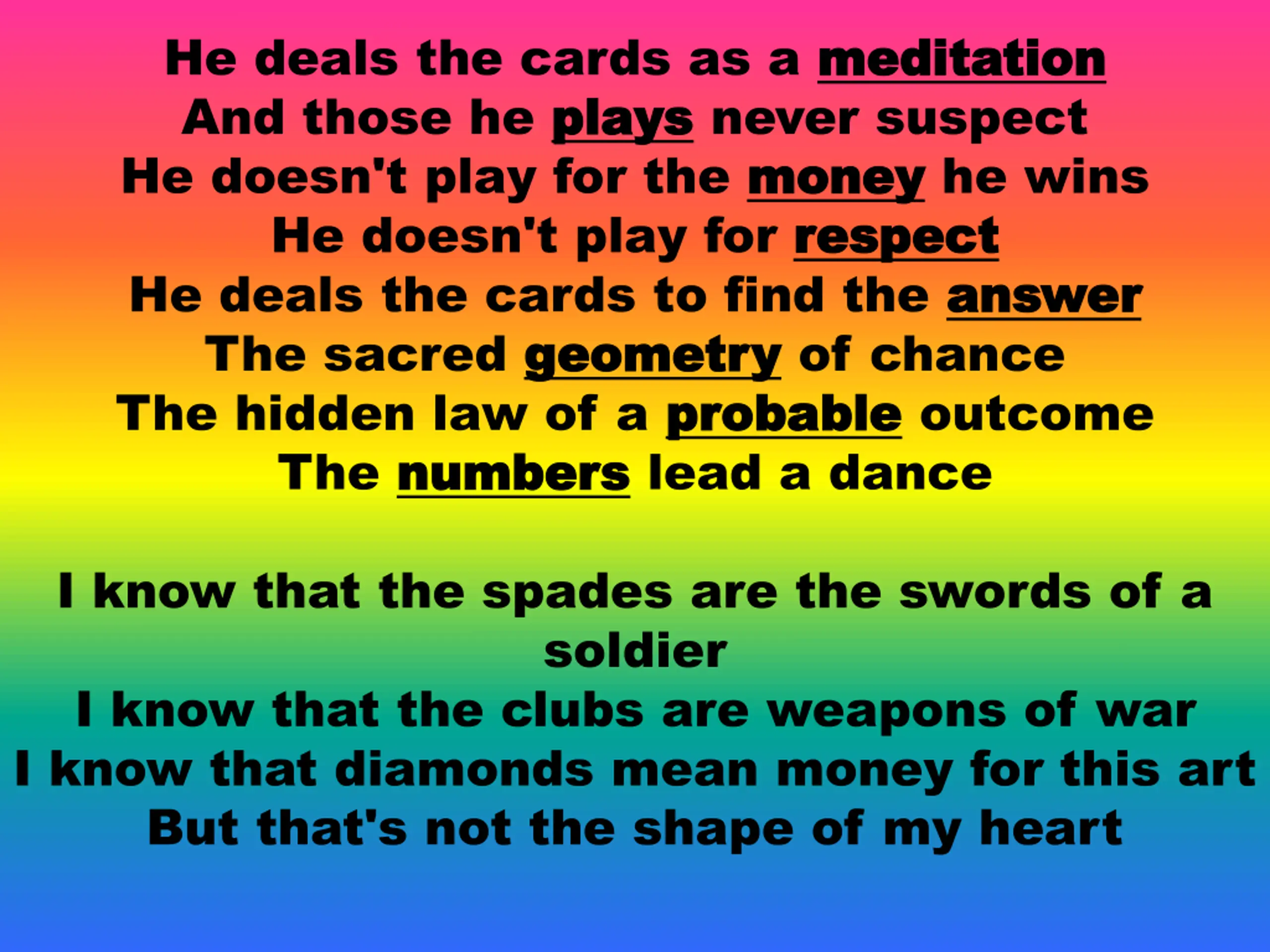He deals the cards as a meditation And those he plays plays never suspect He doesn't play for the money He doesn't play for respect He deals the cards to find the answer The sacred geometry geometry of chance The hidden law of a probable The numbers numbers lead a dance meditation money he wins respect answer probable outcome I know that the spades are the swords of a soldier I know that the clubs are weapons of war I know that diamonds mean money for this art But that's not the shape of my heart