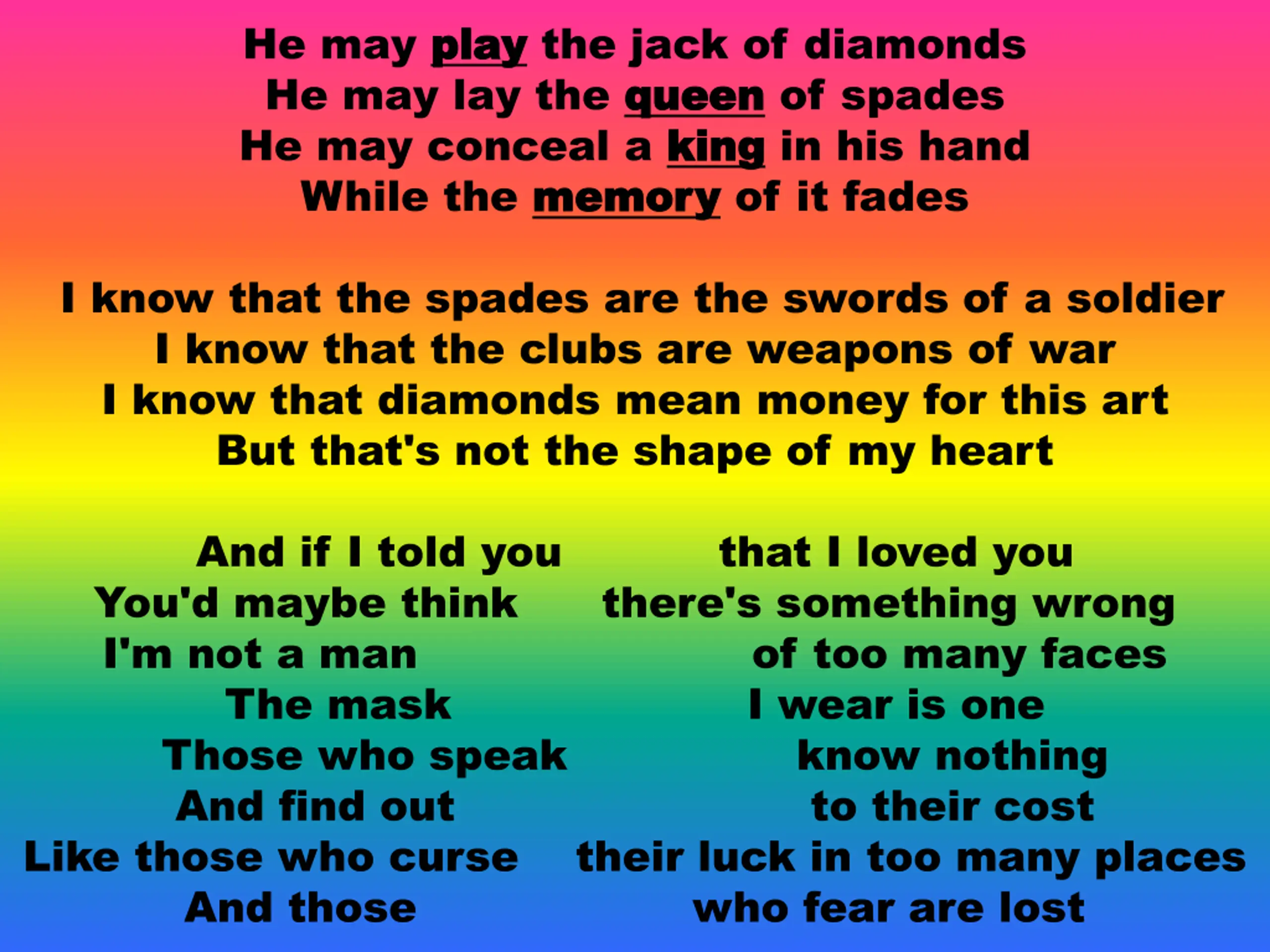 He may play He may lay the queen He may conceal a king While the memory play the jack of diamonds queen of spades king in his hand memory of it fades I know that the spades are the swords of a soldier I know that the clubs are weapons of war I know that diamonds mean money for this art But that's not the shape of my heart And if I told you You'd maybe think I'm not a man The mask Those who speak And find out Like those who curse their luck in too many places And those that I loved you there's something wrong of too many faces I wear is one know nothing to their cost who fear are lost