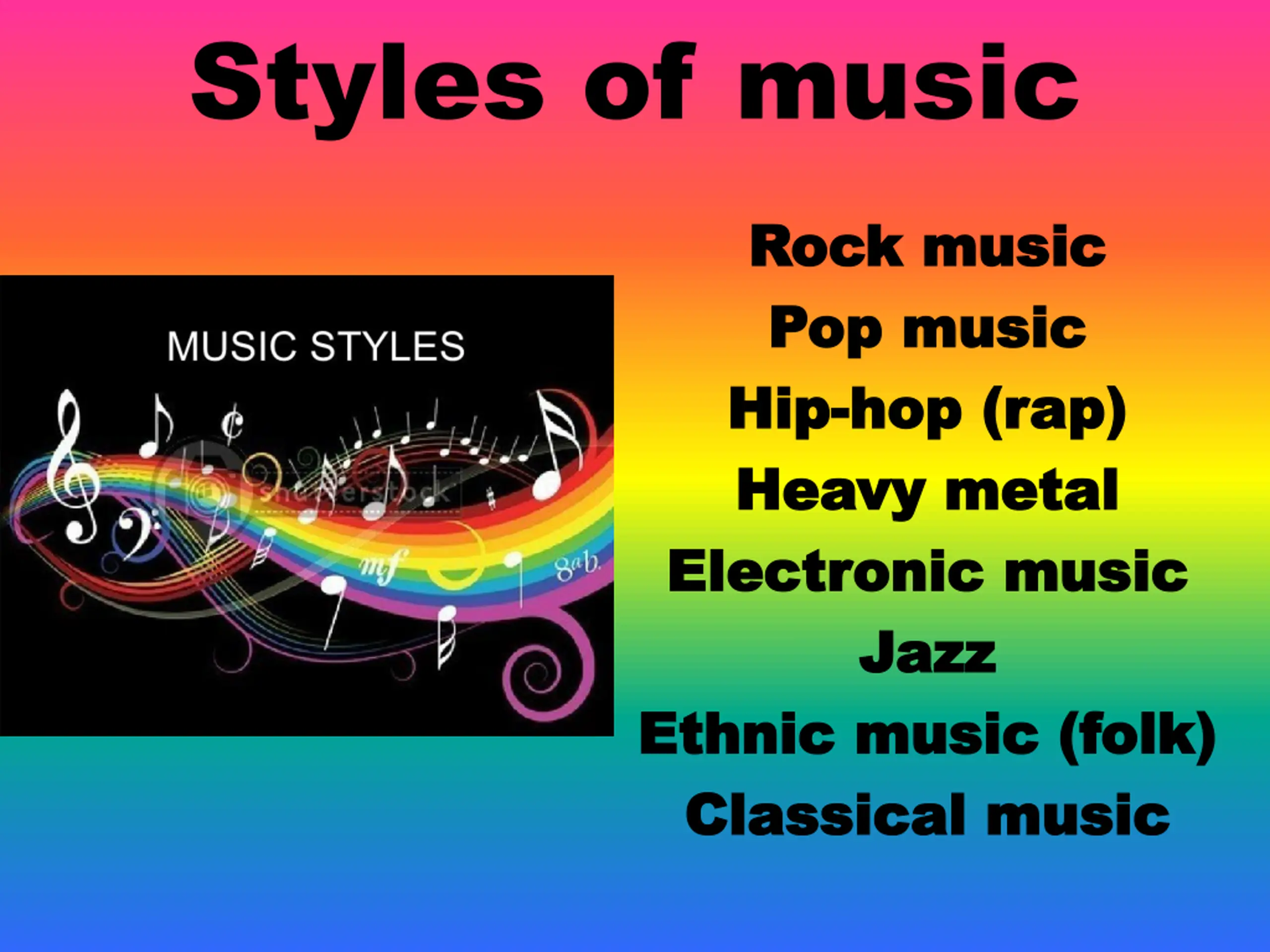 Styles of music Rock music Rock music Pop music Pop music Hip Hip- -hop (rap) hop (rap) Heavy metal Heavy metal Electronic music Electronic music Jazz Jazz Ethnic music (folk) Ethnic music (folk) Classical music Classical music