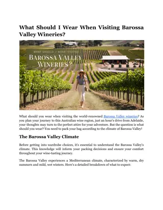 Penfolds Known globally for its iconic Grange wine, Penfolds is a must-visit for any wine lover. The winery offers a range of tasting experiences, including the opportunity to sample some of their rare vintages. Jacob s Creek Famous for its approachable wines, Jacob s Creek provides a beautiful setting for tastings and gourmet food pairings. Their interactive experiences often include guided vineyard walks. Seppeltsfield This historic winery is unique for its Centennial Collection, which includes a tawny port from every year since 1878. Visitors can sample a 100-year-old port, making it a truly exclusive experience. Henschke A family-owned winery renowned for its organic and biodynamic practices, Henschke offers intimate tastings of its premium wines, including the famous Hill of Grace. Yalumba As Australia s oldest family-owned winery, Yalumba is known for its commitment to tradition and innovation. Their Barossa Valley wine tour often includes a visit to the Cooperage, where barrels are crafted. Wine Varieties and Pairings Try and pair your wine tastings with a few of the following things for when you are on your tour.