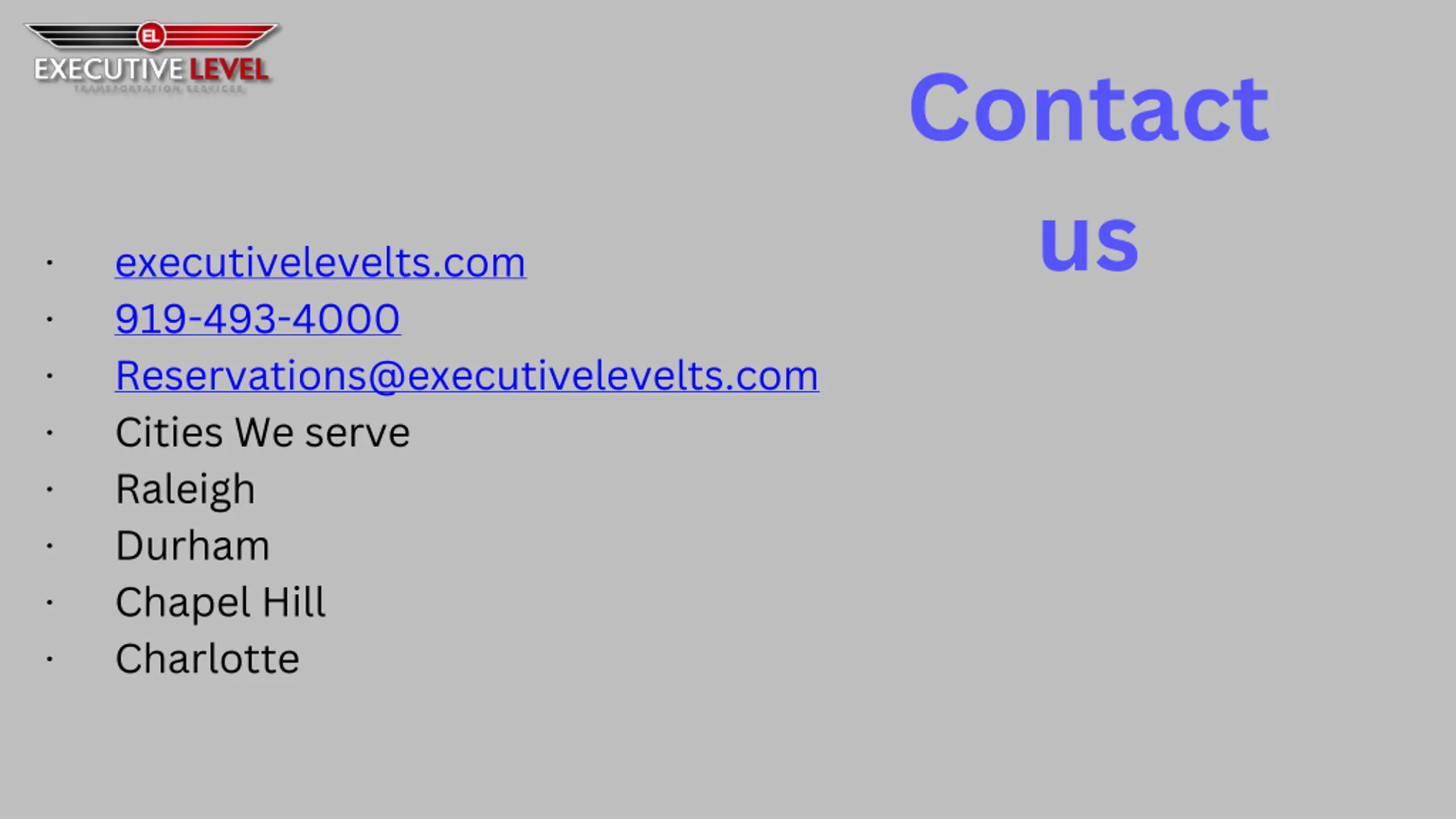 Contact us executivelevelts.com 919-493-4000 Reservations@executivelevelts.com Cities We serve Raleigh Durham Chapel Hill Charlotte