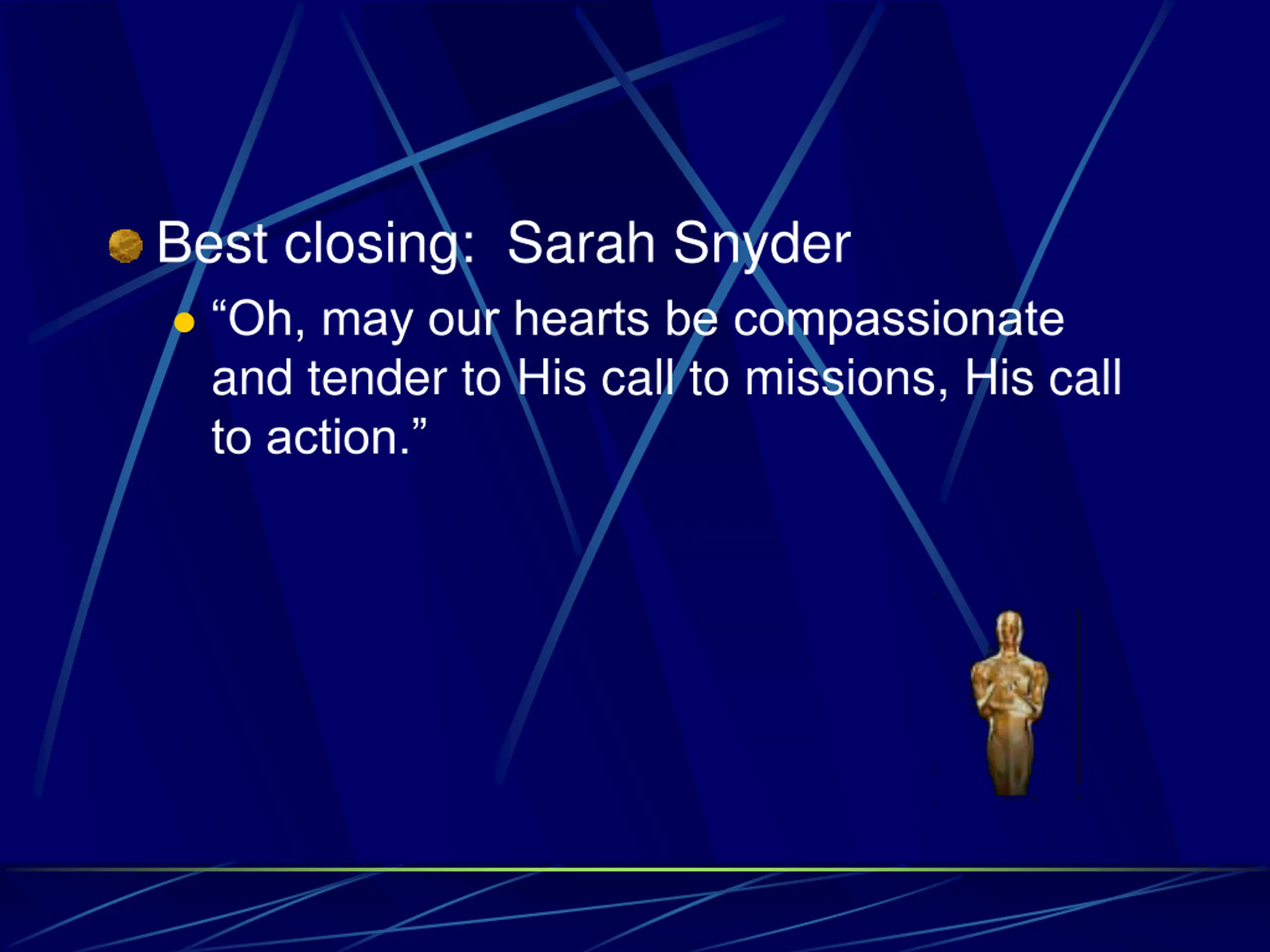 Best closing: Sarah Snyder Oh, may our hearts be compassionate and tender to His call to missions, His call to action.
