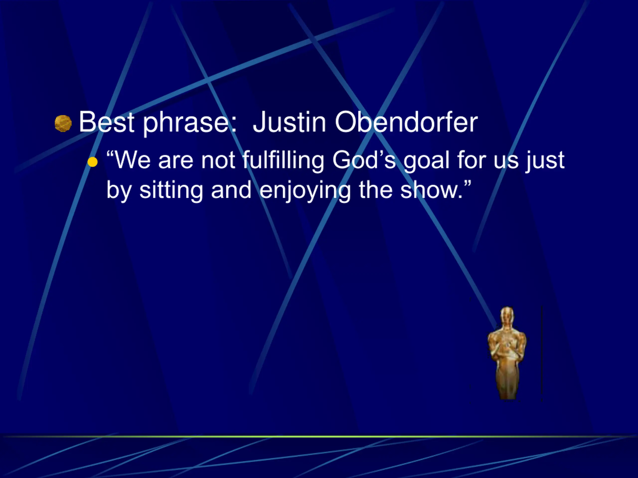 Best phrase: Justin Obendorfer We are not fulfilling God s goal for us just by sitting and enjoying the show.