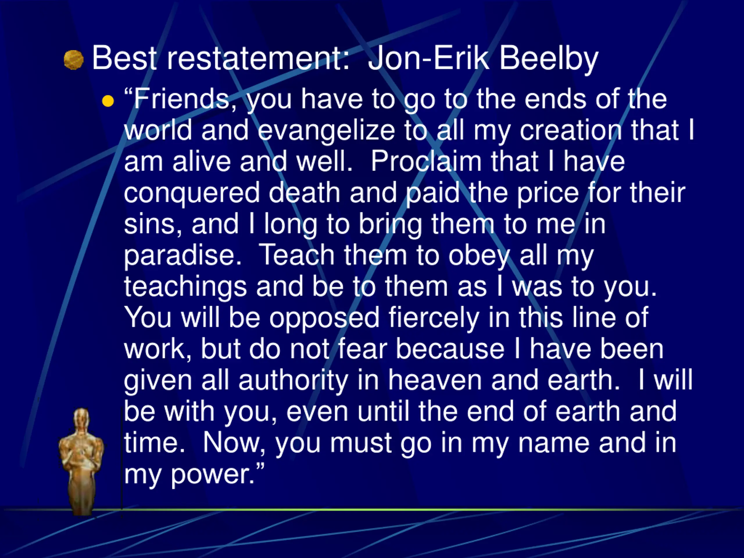 Best restatement: Jon-Erik Beelby Friends, you have to go to the ends of the world and evangelize to all my creation that I am alive and well. Proclaim that I have conquered death and paid the price for their sins, and I long to bring them to me in paradise. Teach them to obey all my teachings and be to them as I was to you. You will be opposed fiercely in this line of work, but do not fear because I have been given all authority in heaven and earth. I will be with you, even until the end of earth and time. Now, you must go in my name and in my power.