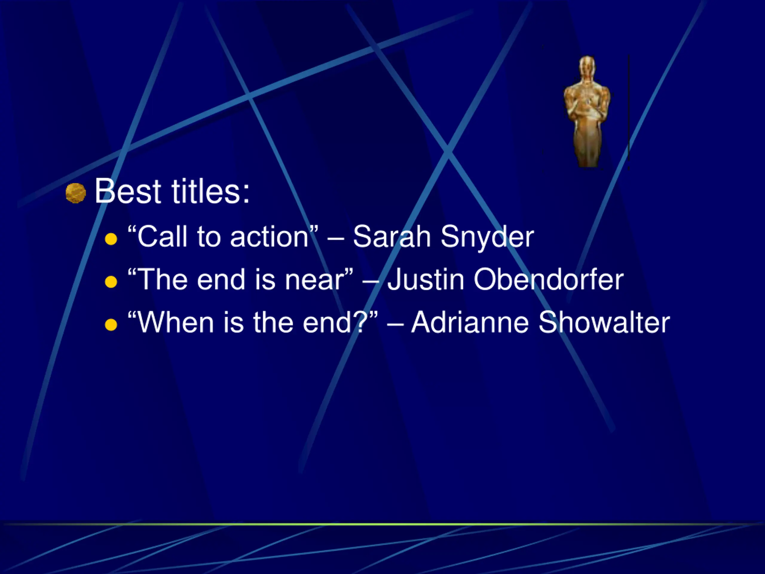 Best titles: Call to action Sarah Snyder The end is near Justin Obendorfer When is the end? Adrianne Showalter