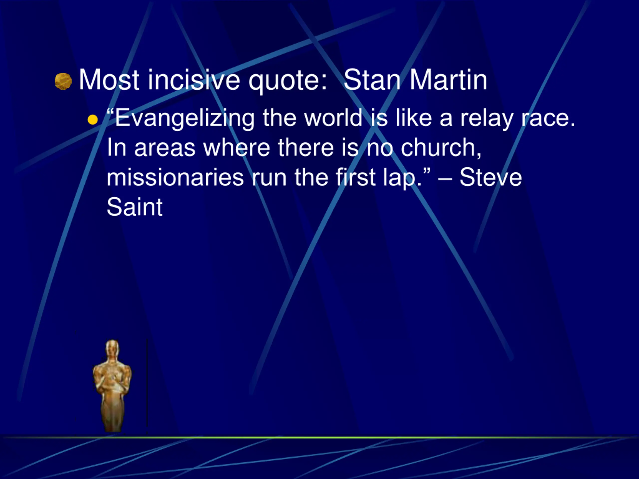 Most incisive quote: Stan Martin Evangelizing the world is like a relay race. In areas where there is no church, missionaries run the first lap. Steve Saint