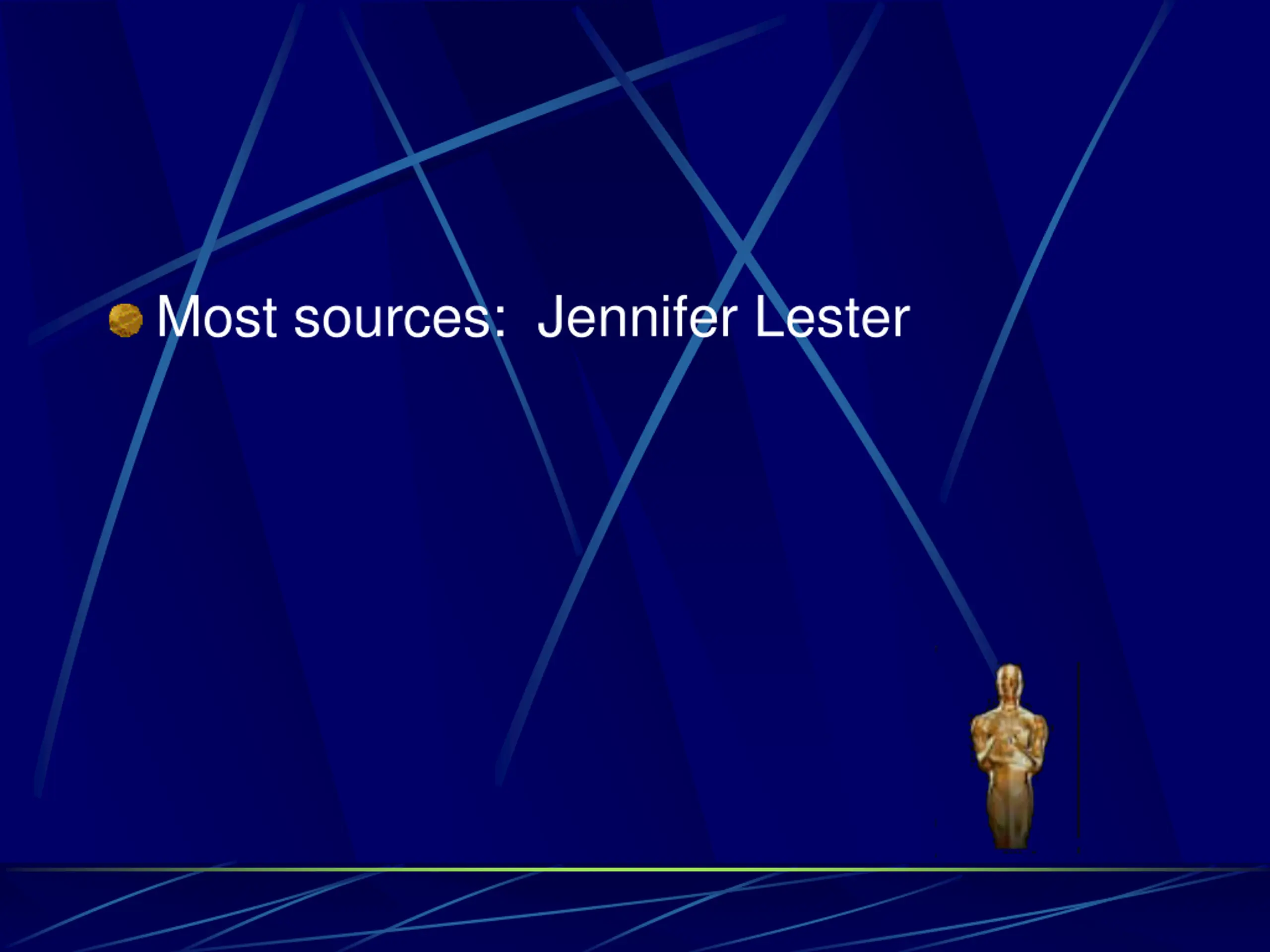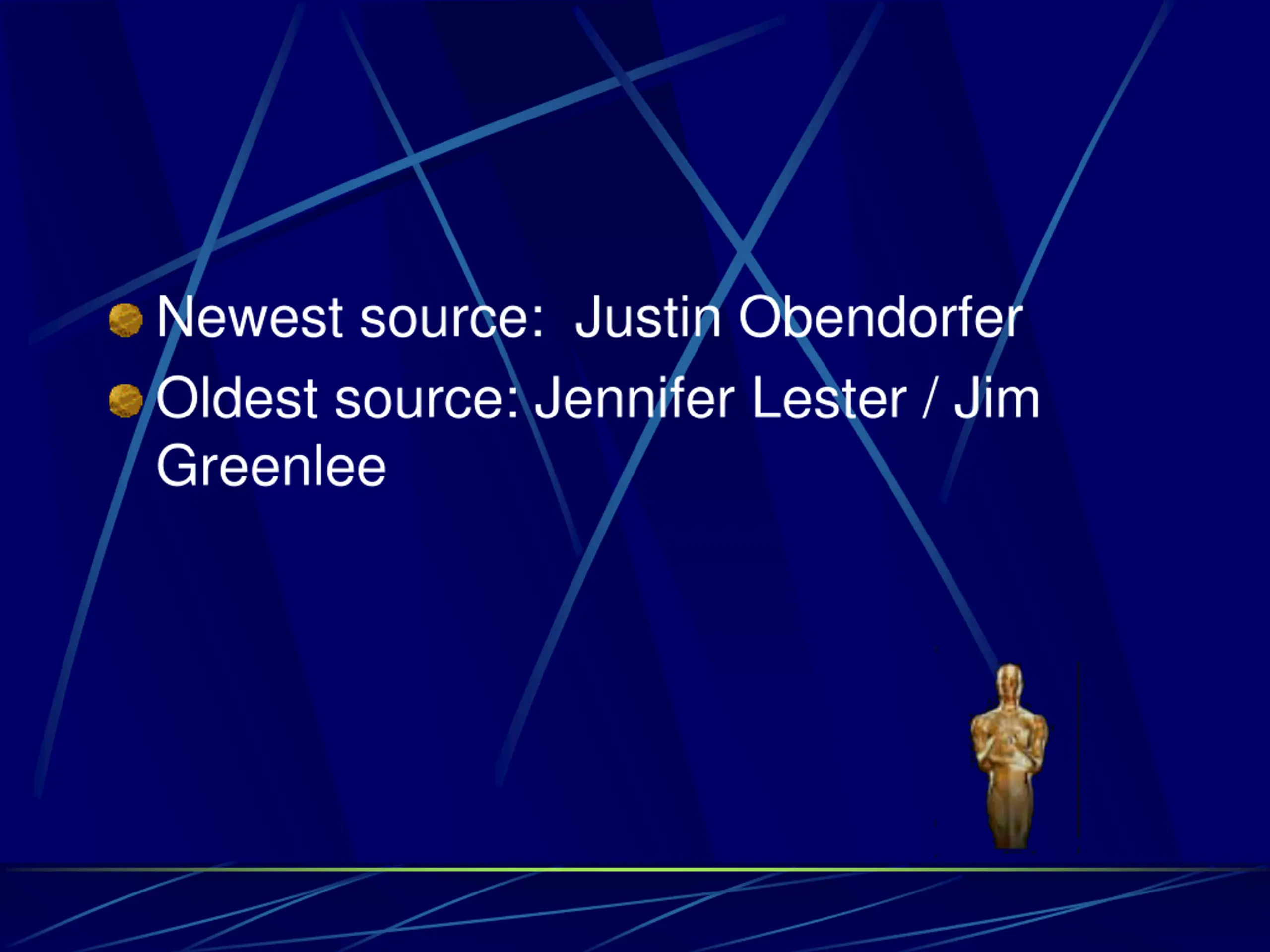 Newest source: Justin Obendorfer Oldest source: Jennifer Lester / Jim Greenlee