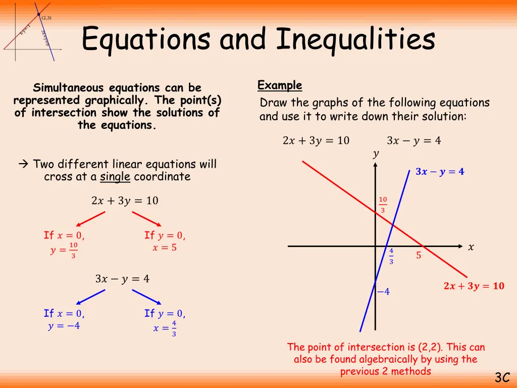 Equations and Inequalities Example Draw the graphs of the following equations and use it to write down their solution: Simultaneous equations can be represented graphically. The point(s) of intersection show the solutions of the equations. 2? + 3? = 10 3? ? = 4 ? Two different linear equations will cross at a single coordinate ?? ? = ? 2? + 3? = 10 10 3 If ? = 0, ? =10 If ? = 0, ? = 5 ? 3 4 3 5 3? ? = 4 ?? + ?? = ?? 4 If ? = 0, ? = 4 If ? = 0, ? =4 3 The point of intersection is (2,2). This can also be found algebraically by using the previous 2 methods 3C