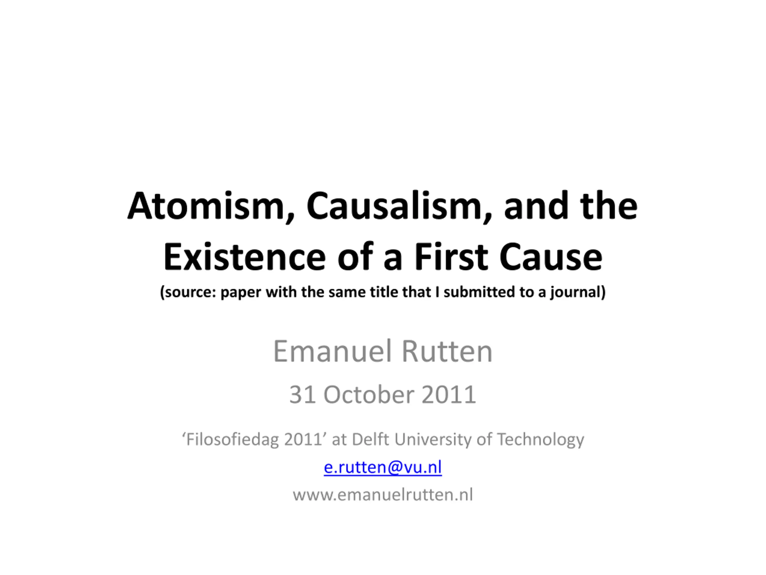 Atomism, Causalism, and the Existence of a First Cause (source: paper with the same title that I submitted to a journal) Emanuel Rutten 31 October 2011 Filosofiedag 2011 at Delft University of Technology e.rutten@vu.nl www.emanuelrutten.nl