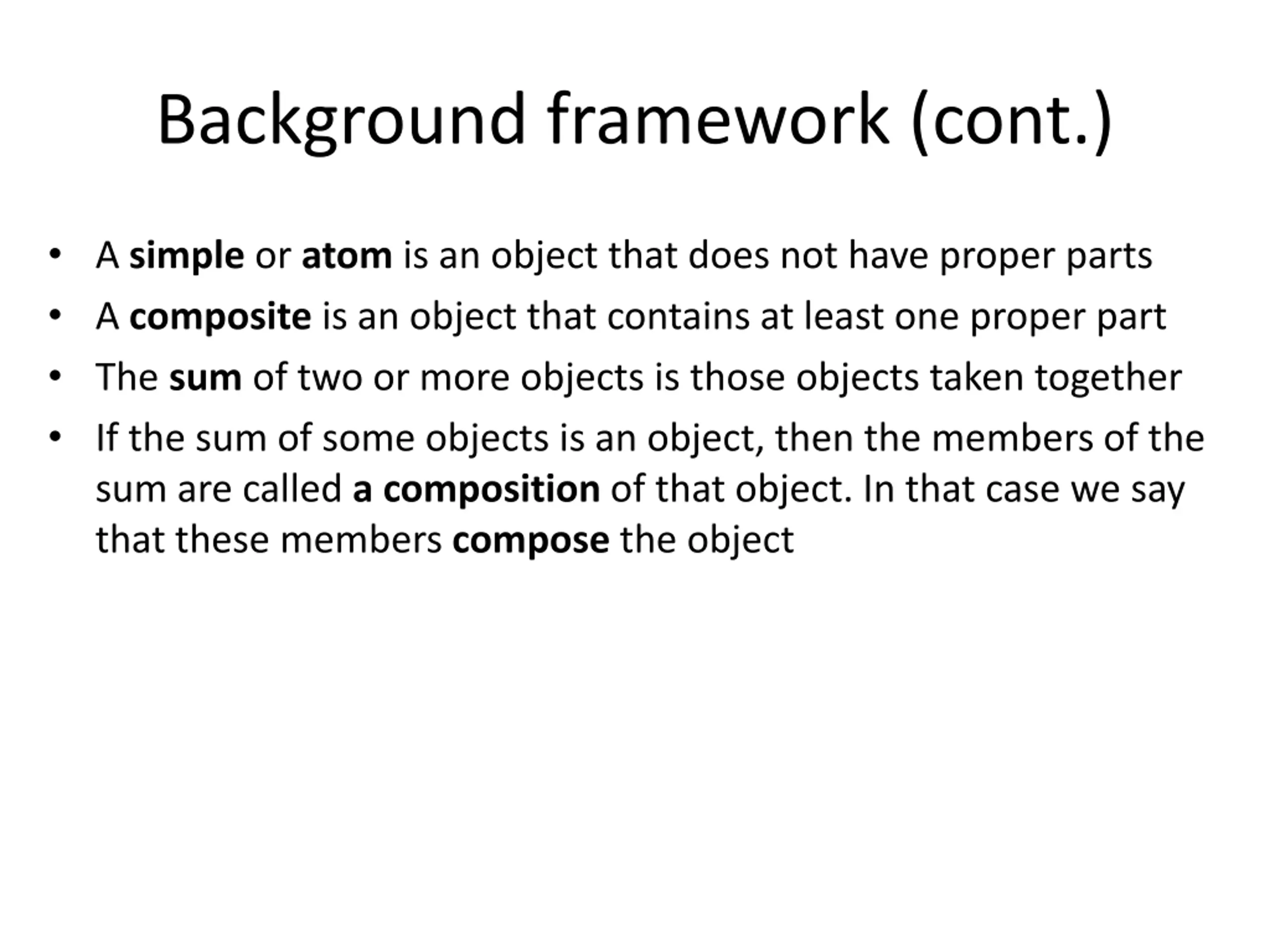 Background framework (cont.) A simple or atom is an object that does not have proper parts A composite is an object that contains at least one proper part The sum of two or more objects is those objects taken together If the sum of some objects is an object, then the members of the sum are called a composition of that object. In that case we say that these members compose the object