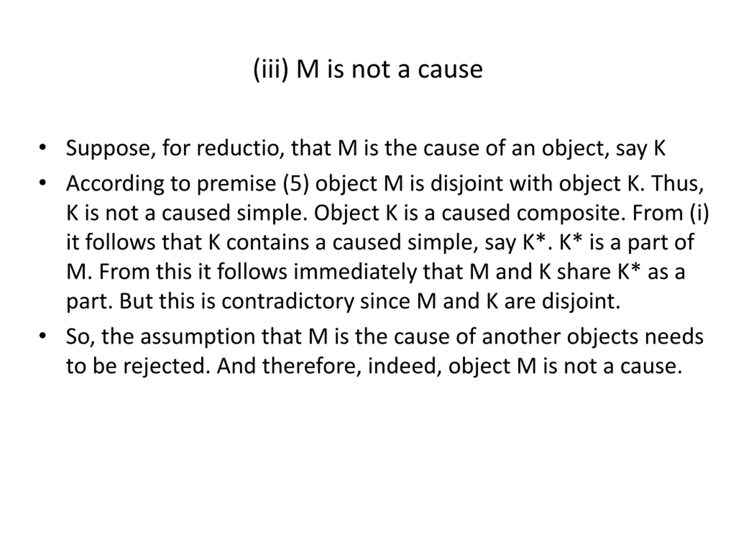 (iii) M is not a cause Suppose, for reductio, that M is the cause of an object, say K According to premise (5) object M is disjoint with object K. Thus, K is not a caused simple. Object K is a caused composite. From (i) it follows that K contains a caused simple, say K*. K* is a part of M. From this it follows immediately that M and K share K* as a part. But this is contradictory since M and K are disjoint. So, the assumption that M is the cause of another objects needs to be rejected. And therefore, indeed, object M is not a cause.