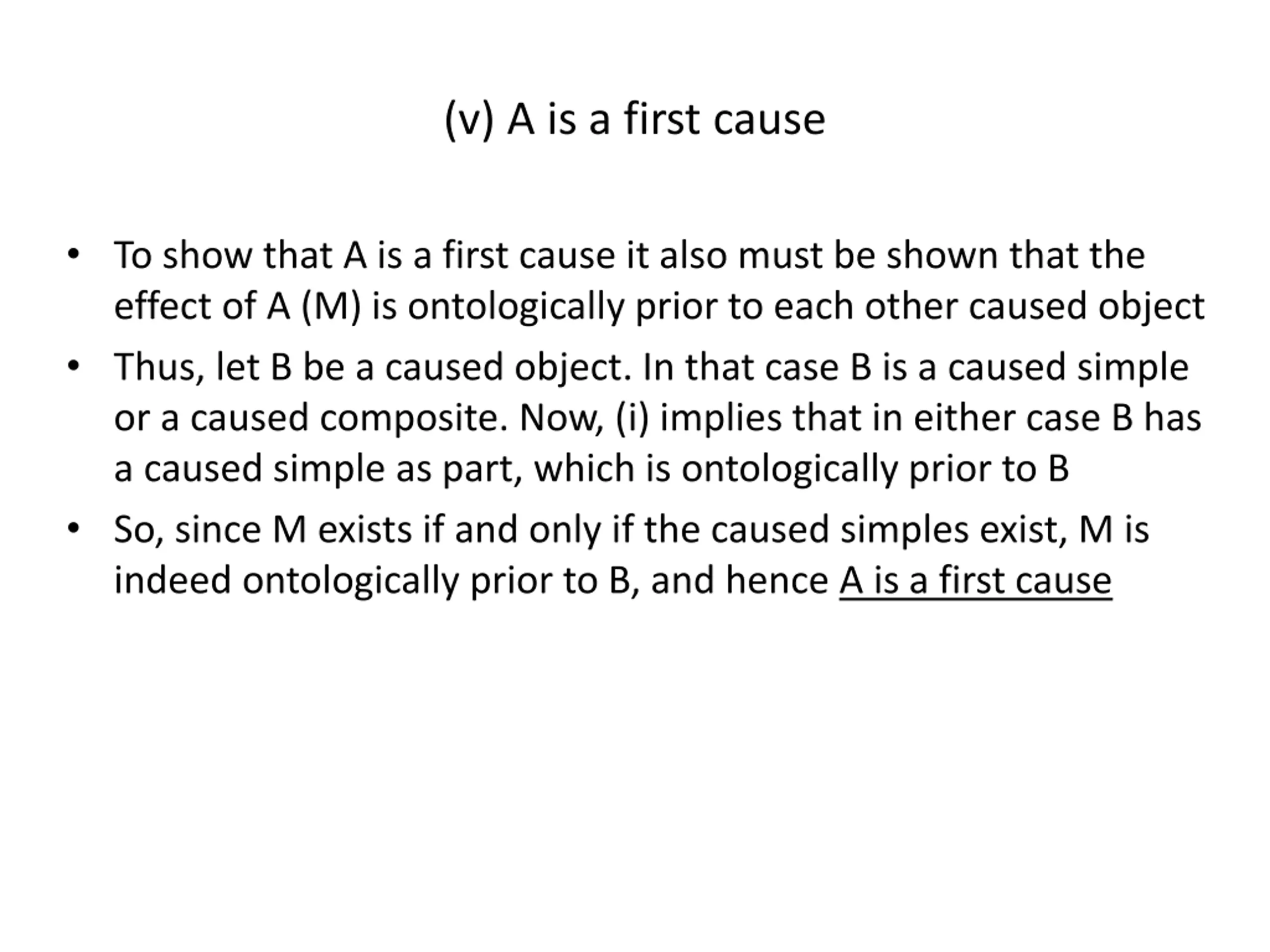 (v) A is a first cause To show that A is a first cause it also must be shown that the effect of A (M) is ontologically prior to each other caused object Thus, let B be a caused object. In that case B is a caused simple or a caused composite. Now, (i) implies that in either case B has a caused simple as part, which is ontologically prior to B So, since M exists if and only if the caused simples exist, M is indeed ontologically prior to B, and hence A is a first cause