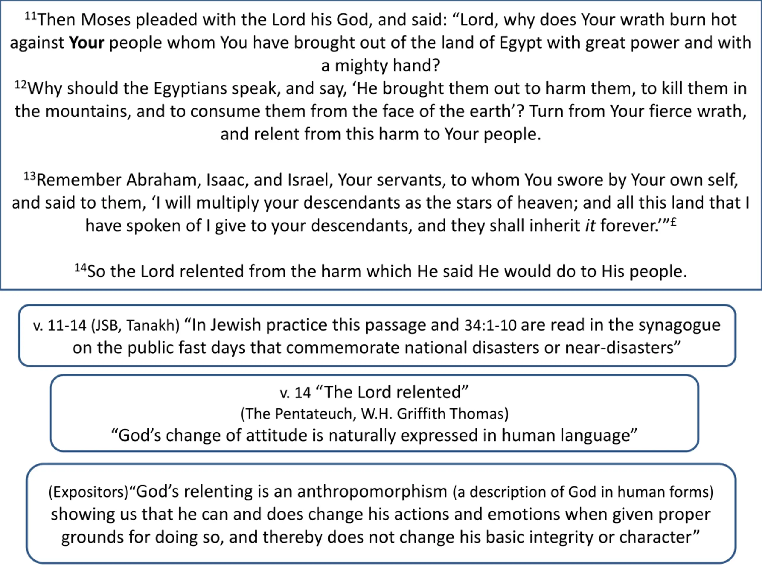 11Then Moses pleaded with the Lord his God, and said: Lord, why does Your wrath burn hot against Your people whom You have brought out of the land of Egypt with great power and with a mighty hand? 12Why should the Egyptians speak, and say, He brought them out to harm them, to kill them in the mountains, and to consume them from the face of the earth ? Turn from Your fierce wrath, and relent from this harm to Your people. 13Remember Abraham, Isaac, and Israel, Your servants, to whom You swore by Your own self, and said to them, I will multiply your descendants as the stars of heaven; and all this land that I have spoken of I give to your descendants, and they shall inherit itforever. 14So the Lord relented from the harm which He said He would do to His people. v. 11-14 (JSB, Tanakh) In Jewish practice this passage and 34:1-10 are read in the synagogue on the public fast days that commemorate national disasters or near-disasters v. 14 The Lord relented (The Pentateuch, W.H. Griffith Thomas) God s change of attitude is naturally expressed in human language (Expositors) God s relenting is an anthropomorphism (a description of God in human forms) showing us that he can and does change his actions and emotions when given proper grounds for doing so, and thereby does not change his basic integrity or character