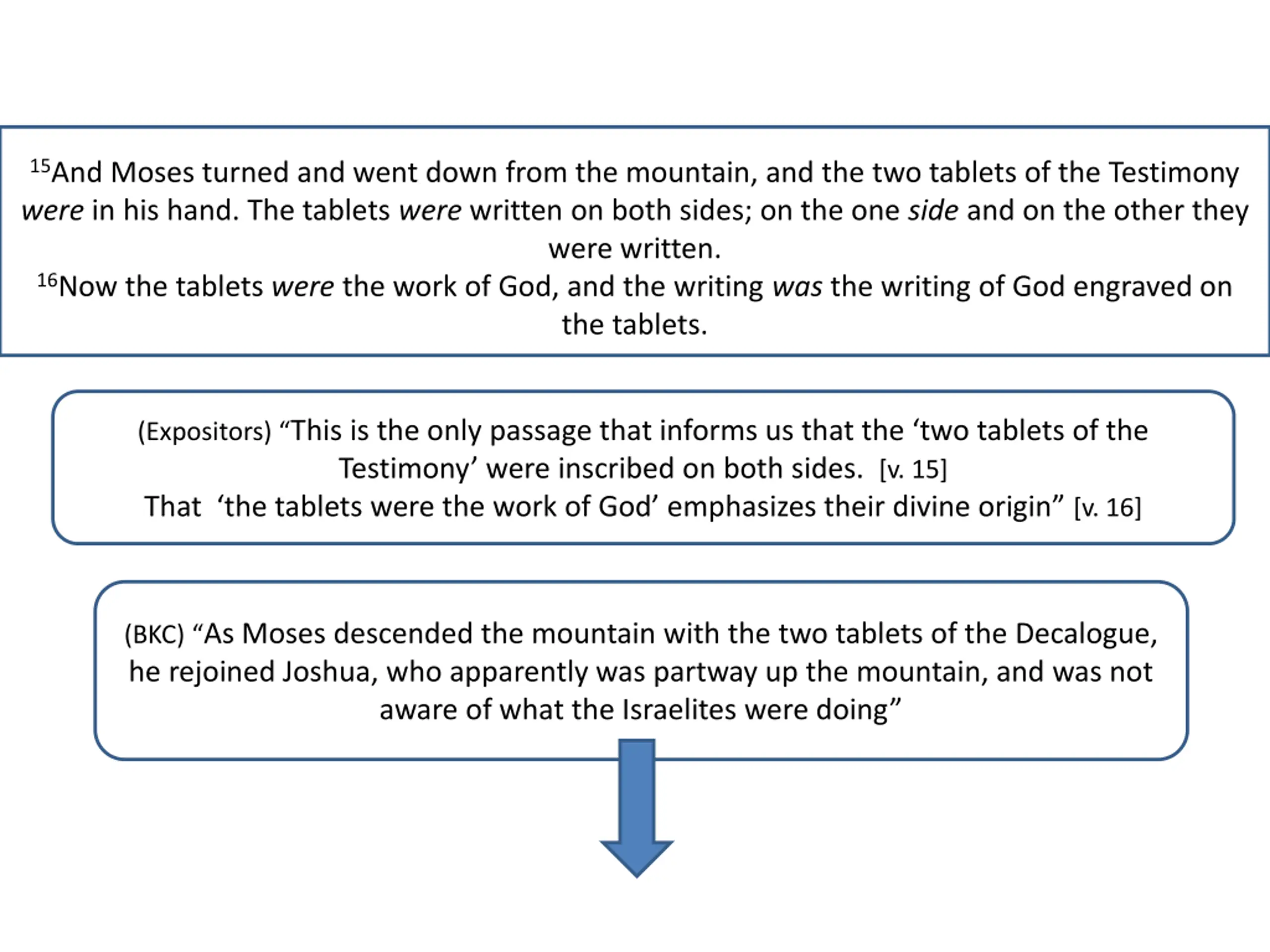 15And Moses turned and went down from the mountain, and the two tablets of the Testimony were in his hand. The tablets were written on both sides; on the one side and on the other they were written. 16Now the tablets were the work of God, and the writing was the writing of God engraved on the tablets. (Expositors) This is the only passage that informs us that the two tablets of the Testimony were inscribed on both sides. [v. 15] That the tablets were the work of God emphasizes their divine origin [v. 16] (BKC) As Moses descended the mountain with the two tablets of the Decalogue, he rejoined Joshua, who apparently was partway up the mountain, and was not aware of what the Israelites were doing