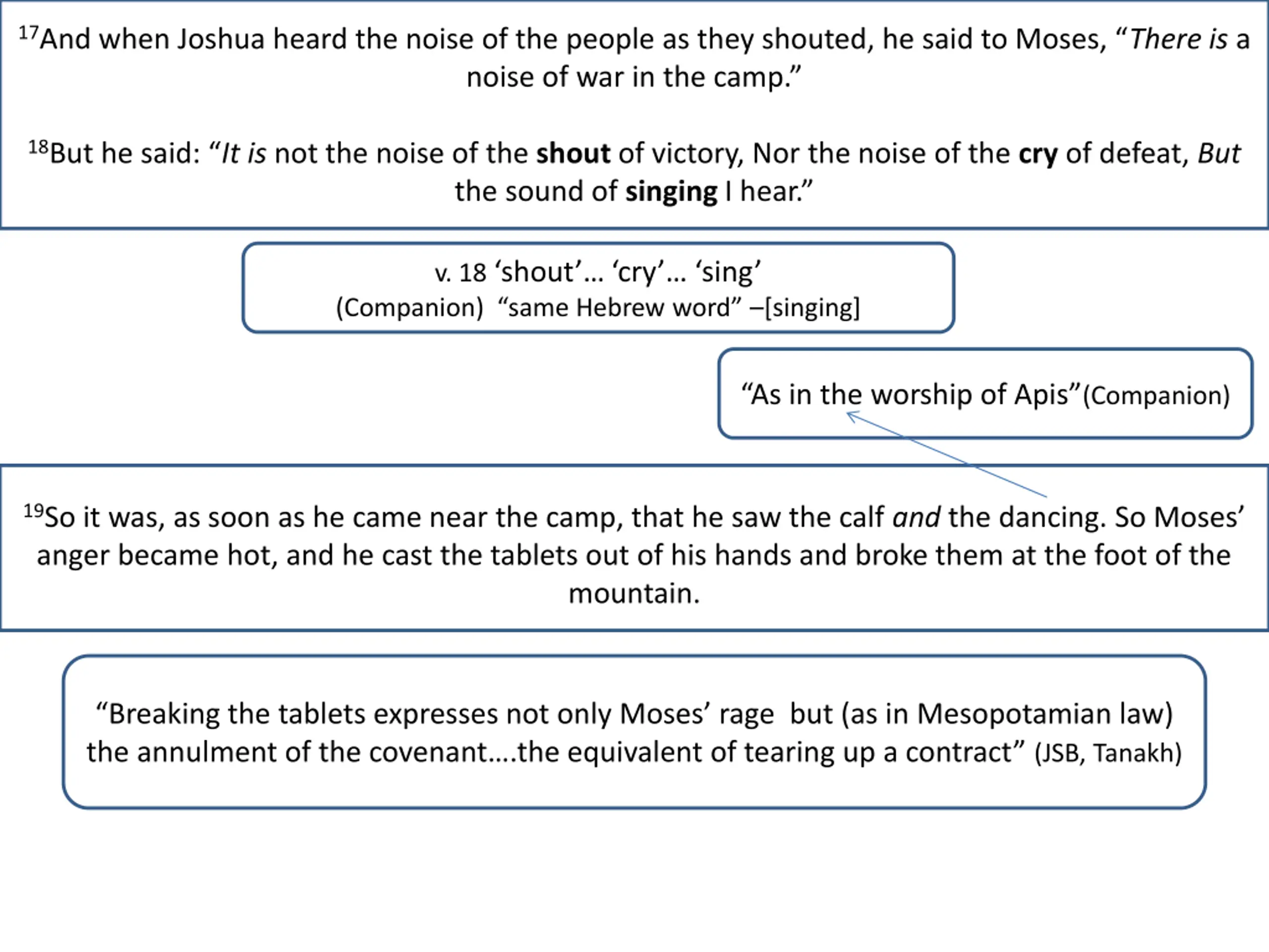 17And when Joshua heard the noise of the people as they shouted, he said to Moses, There is a noise of war in the camp. 18But he said: It is not the noise of the shout of victory, Nor the noise of the cry of defeat, But the sound of singing I hear. v. 18 shout cry sing (Companion) same Hebrew word [singing] As in the worship of Apis (Companion) 19So it was, as soon as he came near the camp, that he saw the calf andthe dancing. So Moses anger became hot, and he cast the tablets out of his hands and broke them at the foot of the mountain. Breaking the tablets expresses not only Moses rage but (as in Mesopotamian law) the annulment of the covenant .the equivalent of tearing up a contract (JSB, Tanakh)